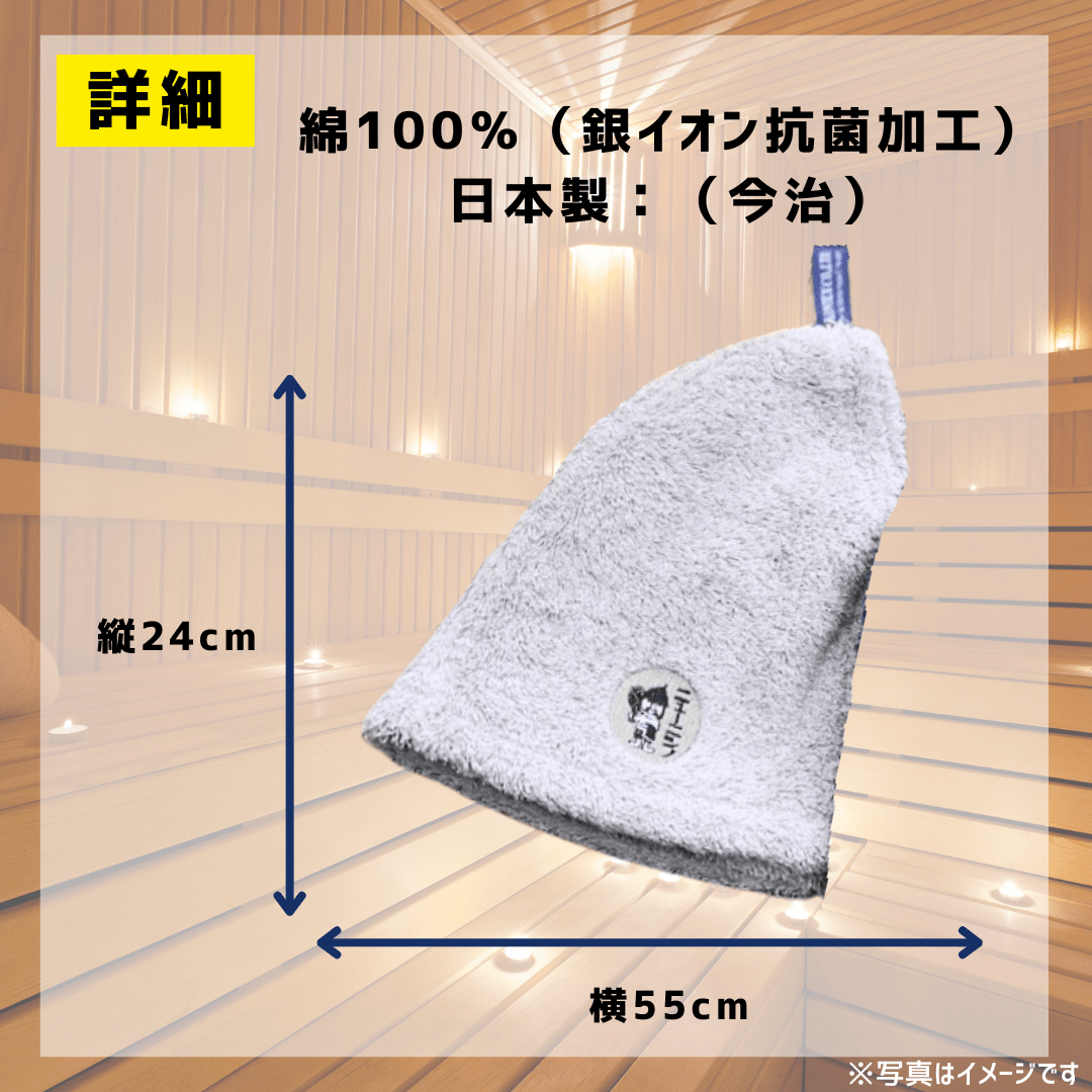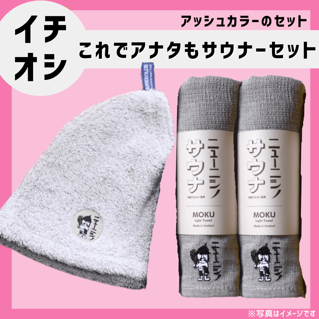 ★★先着5名様にホテルニューニシノオリジナルバッチとシールが付いてくる★★ お届け予定日:2月14日(金)~2月18日(火) ※ご希望の指定日は「お届け予定日2月14日~2月18日」の期間内のみ承っております。 日時指定をご希望の方は決済画面の備考欄にご記入ください。 ※天候や交通状況等によりお届けが遅れる場合がございます。予めご了承ください。 【商品紹介】 ニューニシノオリジナルデザインのタオルと激レアサウナハットがセットになった最強サウナグッズセット! これでアナタも本格サウナー!! 【内容量】 1.サウナ時間がもっと充実!ホテルニューニシノオリジナルサウナハット 2.サウナ好きが作ったタオルセット(ホテルニューニシノオリジナルデザイン) -------------------------------------------------------------------------------------------------------------------------- ~1.サウナ時間がもっと充実!ホテルニューニシノオリジナルサウナハット~ 【商品紹介】 なかなか生産されないホテルニューニシノオリジナルデザインのサウナハットです。 サウナ室での充実度UP!まだサウナハットをお持ちでない方はこの際にいかがでしょうか? ~温泉ソムリエささひなのイチオシポイント~ ★男女兼用!ゆったりサイズなので耳も束ねた髪もしっかり入ります! ★今治タオル生地なので、肌触りがよく、型崩れの心配もなし◎ ★小さなポケット付き!アツアツのロッカーキーでもう悩まない!コインも入るのでロッカーに戻らなくても自動販売機に直行できる! ★冷水に浸してからサウナ室に入るとひんやり気持ちいい ★深く被ることができるので、外気浴も"ととのう"に集中しやすい! 【商品詳細】 サイズ:フリーサイズ(縦24cm×横55cm) 素材:綿100%(銀イオン抗菌加工) カラー:アッシュ 生産国:日本製(今治) 【お手入れ方法】 ●お洗濯の際はネットの使用をお勧めします。ハットのパイル引け防止に加えて、その他の衣服等からの毛羽の付着を防ぐことが出来ます。 ●お洗濯の際は、多少色落ち・毛羽落ちすることがございますので、淡色のものと分けて洗濯してください。 ●天日干しは生地の硬化につながるため、部屋干しもしくは乾燥機の使用をお勧めします。 ●塩素系漂白剤の使用はお控え下さい。 ●温浴施設等の消毒剤や泉質等によって塩素により退色する場合がございます。 ●使用後は速やかに洗濯してください。 ●濡れたままで長時間放置すると移染や色落ちの原因となります。 ●濡れたタオル等とは分けて持ち運びください。 --------------------------------------------------------------------------------------------------------------------------- ~2.サウナ好きが作ったタオルセット(ホテルニューニシノオリジナルデザイン)~ 【商品紹介】 サウナ好きが作ったタオル2本セット!銭湯・サウナにはこのタオル1本で行ってしまうミニマリスト続出! ホテルニューニシノオリジナルデザインのタオルです。 ~温泉ソムリエささひなのイチオシポイント~ ★重さはハンカチ以上、タオル未満の50g!サウナ、ジム、足湯、ガーデニング、キャンプ...色んな場面に持ち運べます☆ ★軽いのに驚異の吸水力!パイル素材がしっかり水分をキャッチ! ★長さは普通のタオルより20cm長い100cm!サウナハットの代わりに、色んな巻き方で熱から髪と顔を守ります! ★最短1時間半でカラカラに乾くので、荷造りも困らない! 【商品詳細】 サイズ:Mサイズ(フェイスタオル) 33×100cm 素材:綿100% カラー:アッシュ2枚 生産国:日本製(今治) 【お手入れ方法】 ●多少の色落ち、毛羽立ちがありますので他のものとは別に洗ってください。 ●タオルの風合いと吸水性を損ねる原因となりますので、柔軟剤は極力使用しないでください。 ●ドライクリーニング、漂白剤は使用しないでください。 【商品に関してのお問合せ】 ホテルニューニシノ 電話:099-224-3232