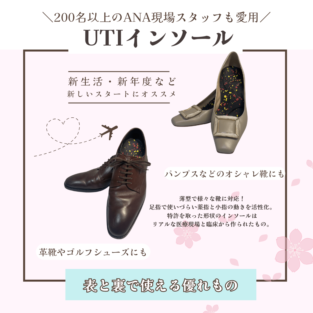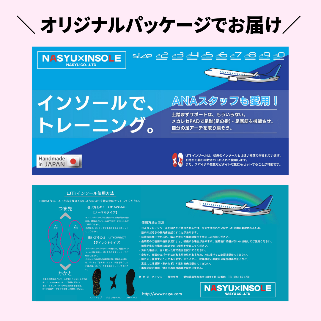 インソール販売期間:2/27(木) 12:20~3/31(月)12:00まで \ インソールについて詳しくLIVEでご紹介/ ANACAの元OGでもあり、ANAの健康経営に携わる「めぐさん」もご出演! 是非、購入前に見逃し配信もご視聴ください。 ☆インソールLIVE見逃し配信はこちら☆ お届け予定日:3月12日(水)より順次お届け ※日時指定は出来かねますので予めご了承ください。 ※ゆうパケット便でのお届けとなるため、日時指定は出来かねますので予めご了承ください。 ※発送通知日の翌日~翌々日までに原則ポストにお届けいたします。 ※天候や交通状況等によりお届けが遅れる場合がございます。予めご了承ください。 ★トレーニングインソール UTI(UNDER THE INSOLE)★ 医療のスペシャリストたちが長年研究し、職人が1つ1つこだわりを持って作り上げたハンドメイドインソールです。 薄型で様々な靴に対応できることが特徴で、人間の足指で使いづらい薬指と小指の動きを活性化させます。 ANAの現場スタッフやプロスポーツ選手なども愛用のトレーニングインソール! お出かけや運動が楽しくなる春の季節に是非いかがでしょうか。 <受賞歴> 日本特許番号 6959687 NASYU(株) 中国特許番号 ZL 2019 8 0096807.0 NASYU(株) 日本特許番号 5319179 ブレース・フィット合同会社 インソールメーカー初の予防医療の普及を目的として経済産業省(異分野新連携事業分野開拓計画)認定企業に選出 ※お客様都合によるお申し込み後の商品のサイズの変更、およびお届け後の返品・交換は承っておりません。 ※ギフトラッピングは受け付けておりませんので予めご了承ください。 ☆保証に関して☆ 保証対象の不具合内容(初期不良):破れ、剥がれ 保証対象だった場合の対応方法:メーカーに問い合わせの上、メーカー指定先の住所に破損したインソールを郵送してください 保証期間:購入から60日 メーカー(NASYU株式会社)の問い合わせ先リンク:mailto:nasyu.center@bracefit.co.jp