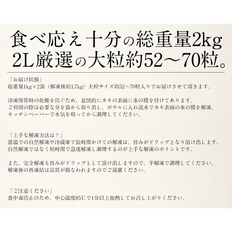 カキ 牡蠣 広島 かき 剥き身 2kg(1kg×2袋/解凍後1.7kg/大粒2L約52-70粒)広島県産[送料無料] 広島牡蠣 大きい 大粒 冷凍牡蠣 冷凍かき 大量 まとめ買い 広島カキ 魚介 海産物 海鮮 ギフト グルメ プレゼント