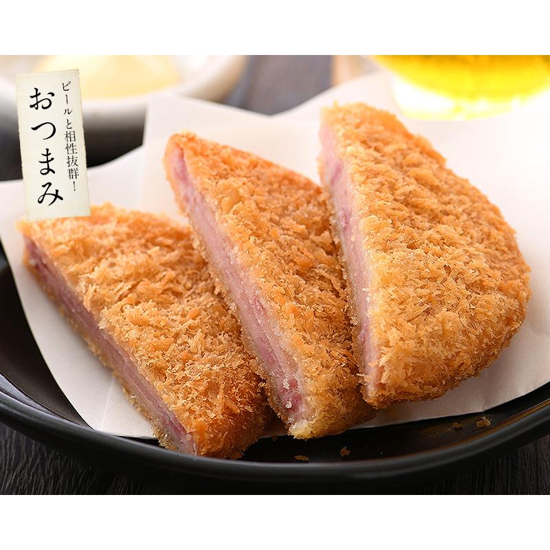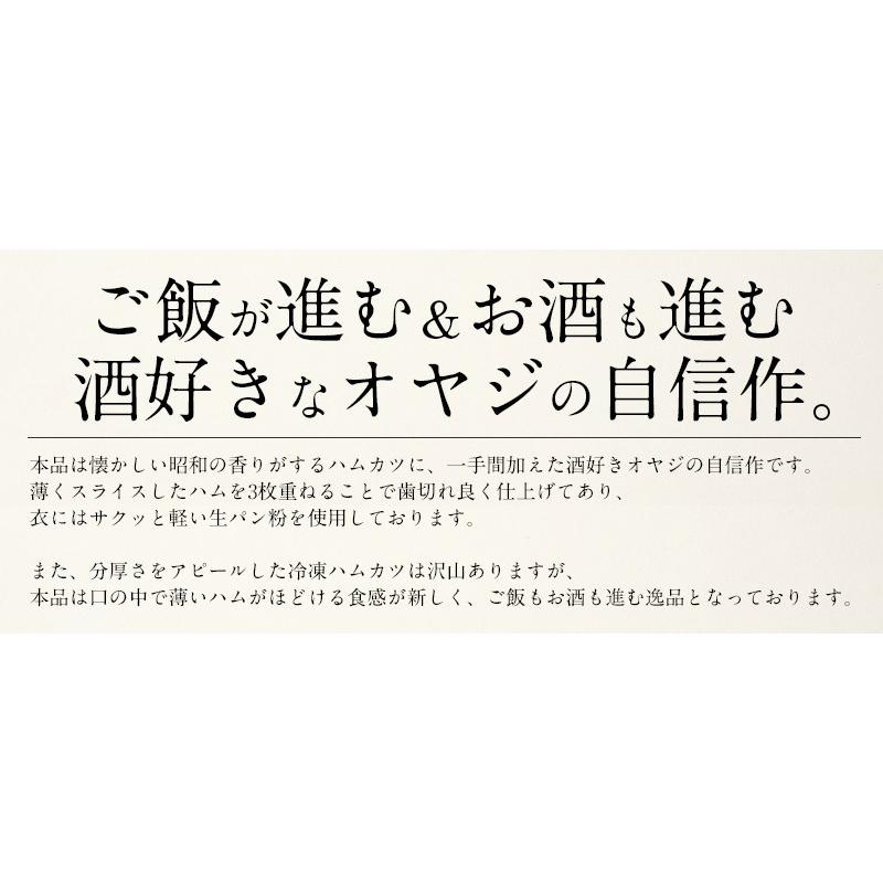 本品は懐かしい昭和の香りがするハムカツに、一手間加えた酒好きオヤジの自信作です。薄くスライスしたハムを3枚重ねることで歯切れ良く仕上げてあり、衣にはサクッと軽い生パン粉を使用しております。