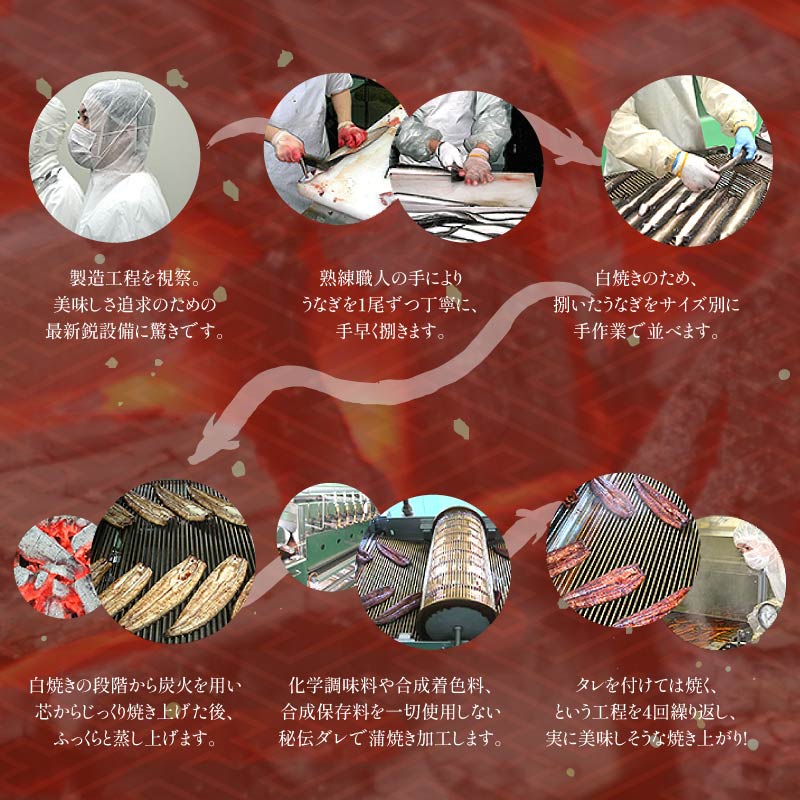 次にタレ漬けと焼きの作業を合計4回繰り返し丹念に焼き上げますが、化学調味料や合成着色料、合成保存料を一切使用しない秘伝ダレで蒲焼き加工してあります。また、遠赤外線の効果で中心までしっかり火が通っているため、表面は香ばしく、身はふっくら柔らかなのが本品の特徴です。