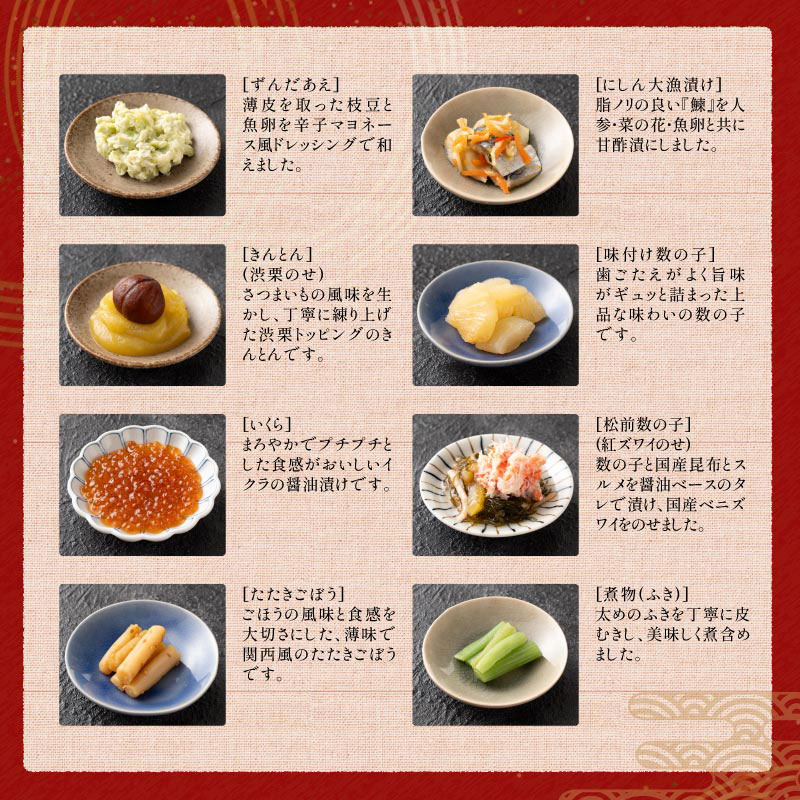 本品はおせち料理に欠かせない食材を厳選し詰め合わせた、黒毛和牛と蟹のセットが選べる当店こだわりのおせちです。2、3人前を目安にお召し上がり頂ける内容量となっており食べ応えも十分。さらに贈り物にもお使い頂ける風呂敷包み仕様となっております。