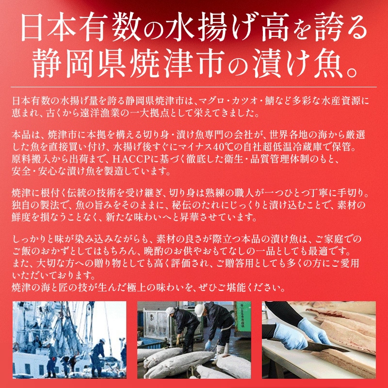 港町焼津で培われた伝統の技を生かし、切身は職人の手切りにこだわっております。 魚の美味しさはそのままに漬け床に閉じ込める独自製法で、秘伝のタレに漬け込んだ魚は、 その素材と鮮度を損なうことなく新しい味覚に作り上げられております。