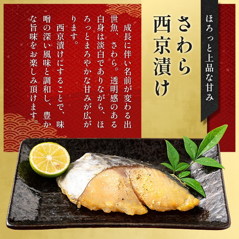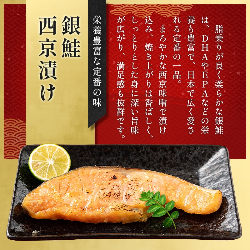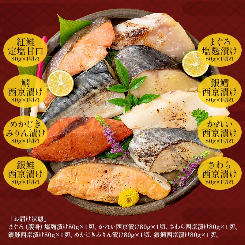 漬け魚8種(銀だら西京漬け80g×1切れ、まぐろ塩麹漬け80g×1切れ、銀鮭西京漬け80g×1切れ、紅鮭定塩甘口80g×1切れ、メカジキみりん漬け80g×1切れ、さば西京漬け80g×1切れ、かれい西京漬け80g×1切れ、さわら西京漬け80g×1切れ)
