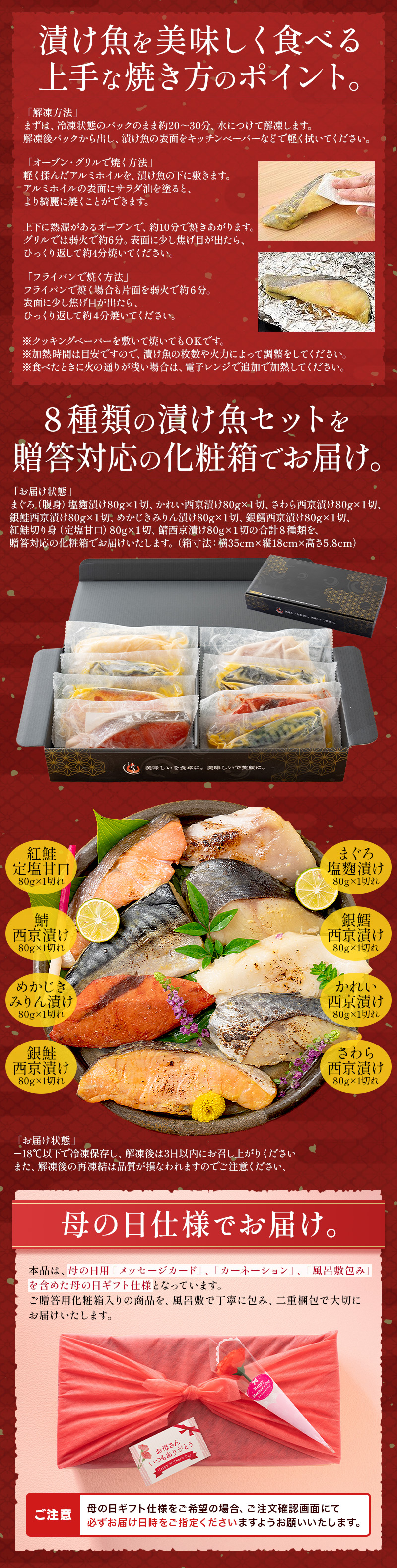 漬け魚 8種 セット (各80g×1切れ) 銀だら まぐろ 銀鮭 紅鮭 メカジキ さば かれい さわら 母の日