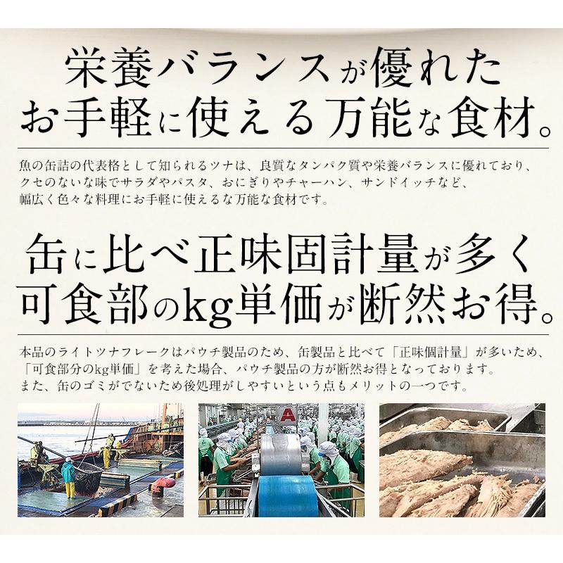 本品のライトツナフレークはパウチ製品のため、缶製品と比べて「正味個計量」が多いため、「可食部分のkg単価」を考えた場合、パウチ製品の方が断然お得となっております。また、缶のゴミがでないため後処理がしやすいという点もメリットの一つです。