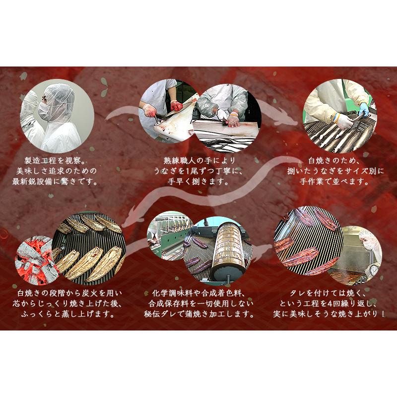 次にタレ漬けと焼きの作業を合計4回繰り返し丹念に焼き上げますが、化学調味料や合成着色料、合成保存料を一切使用しない秘伝ダレで蒲焼き加工してあります。また、遠赤外線の効果で中心までしっかり火が通っているため、表面は香ばしく、身はふっくら柔らかなのが本品の特徴です。