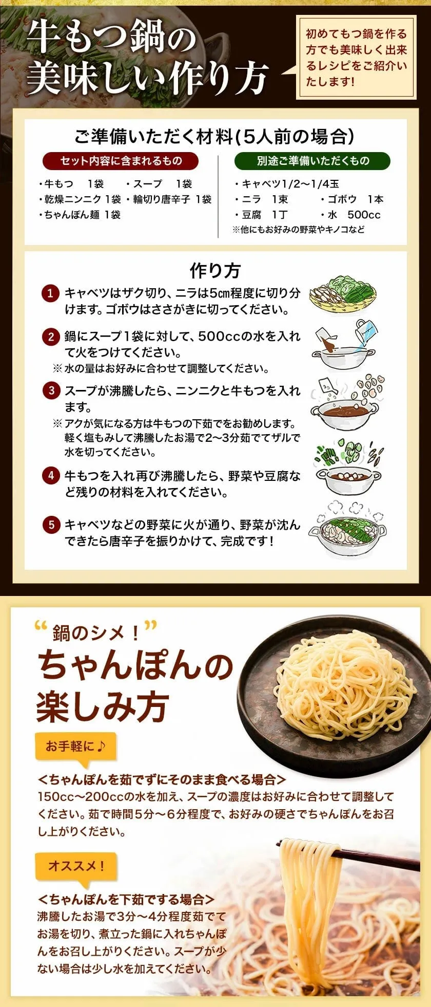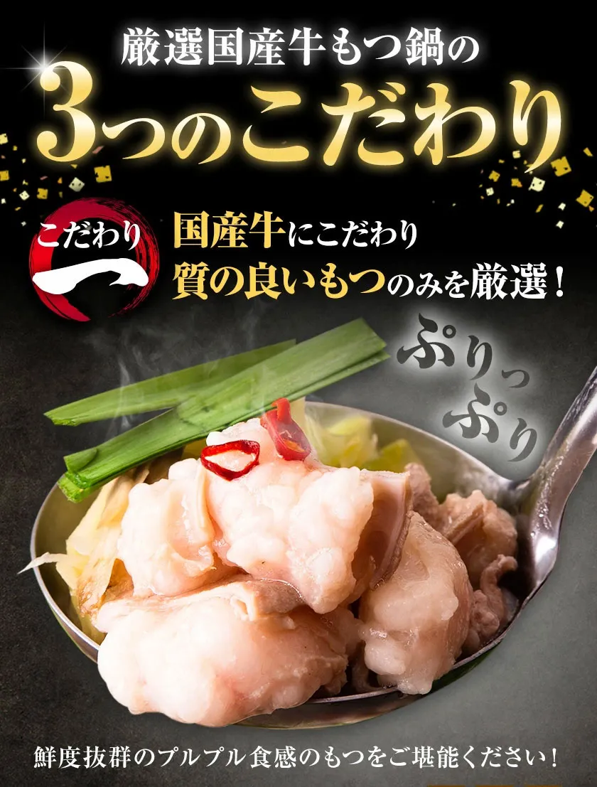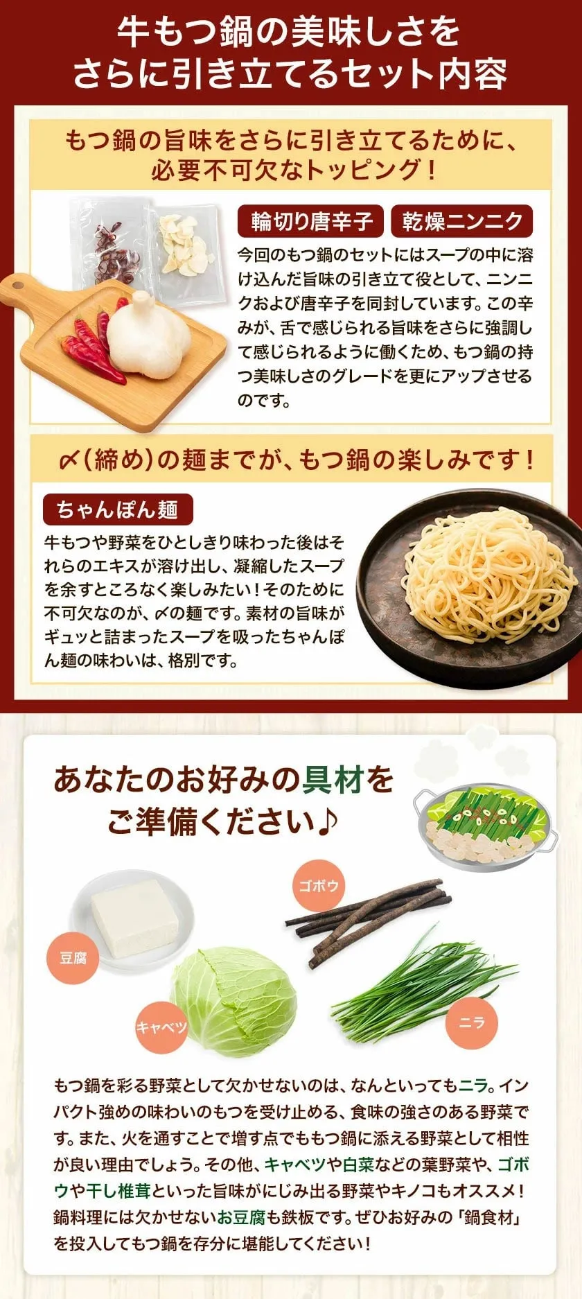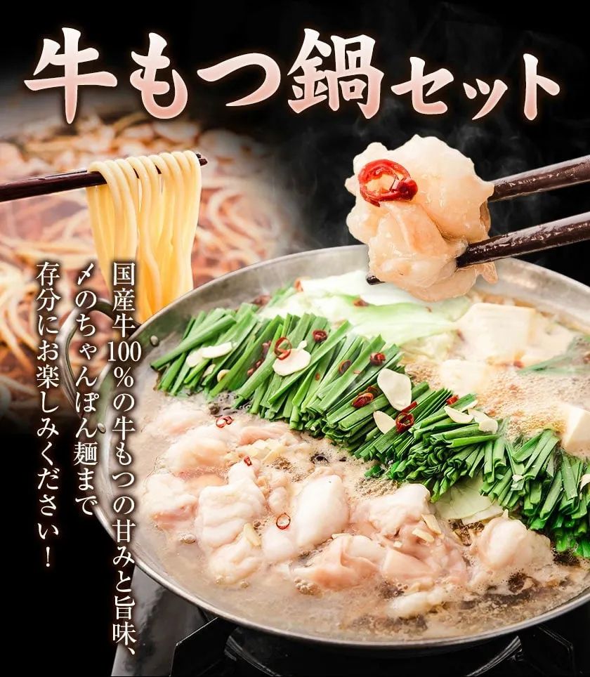■名称 もつ鍋セット ■内容 モツ(国産牛小腸)500g×1袋 ちゃんぽん麺 90g×2袋 スープ 100ml×1袋 輪切り唐辛子 0.5g×1袋 乾燥ニンニク 3g×1袋 ■原材料 モツ:小腸(国産牛)麺:小麦粉(国内製造)、小麦たん白、食塩/酒精、かん水、具Ca、クチナシ色素、加工でん粉 スープ:醤油(国内製造)、アミノ酸液、食塩、魚介エキス/調味料(アミノ酸等)、甘味料(ステビア、甘草)、保存料(パラオキシ安息香酸)、(一部に大豆・小麦・さばを含む) 薬味:【ガーリックスライス】ガーリック(中国)【輪切り唐辛子】唐辛子(中国) ■保存方法 -18℃以下で保存してください。 ■配送方法 ヤマト運輸、佐川急便、日本郵政の冷凍便でお届けさせていただきます。 ※配送業者の指定は出来かねます。 ■送料 本商品は、送料無料です。 但し、配送先北海道の場合、別途330円(税込) の追加送料が配送口数分発生いたします。 また、配送先が沖縄・離島等の場合、別途525円(税込) の追加送料が配送口数分発生いたします。