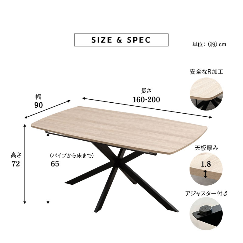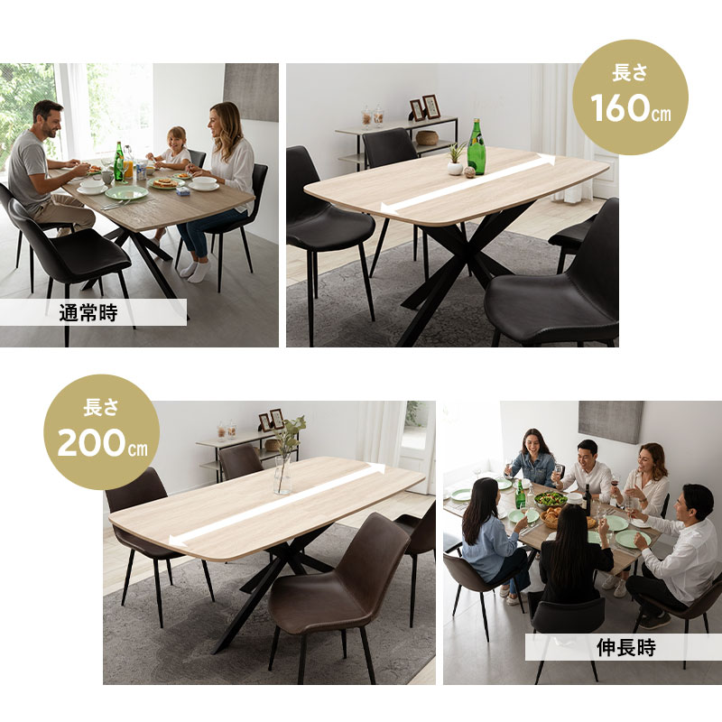 | ダイニングテーブル | ■サイズ 約幅160-200×奥行90×高さ72cm ■材質 天板:プリント化粧繊維板 脚:スチール(粉体塗装) ■カラー オーク ※ライン状の模様は、素材の特徴を再現したものです。傷ではございません。あらかじめご了承ください。 ■機能 伸長機能 ■重量 約35kg ■耐荷重 天板:約50kg |