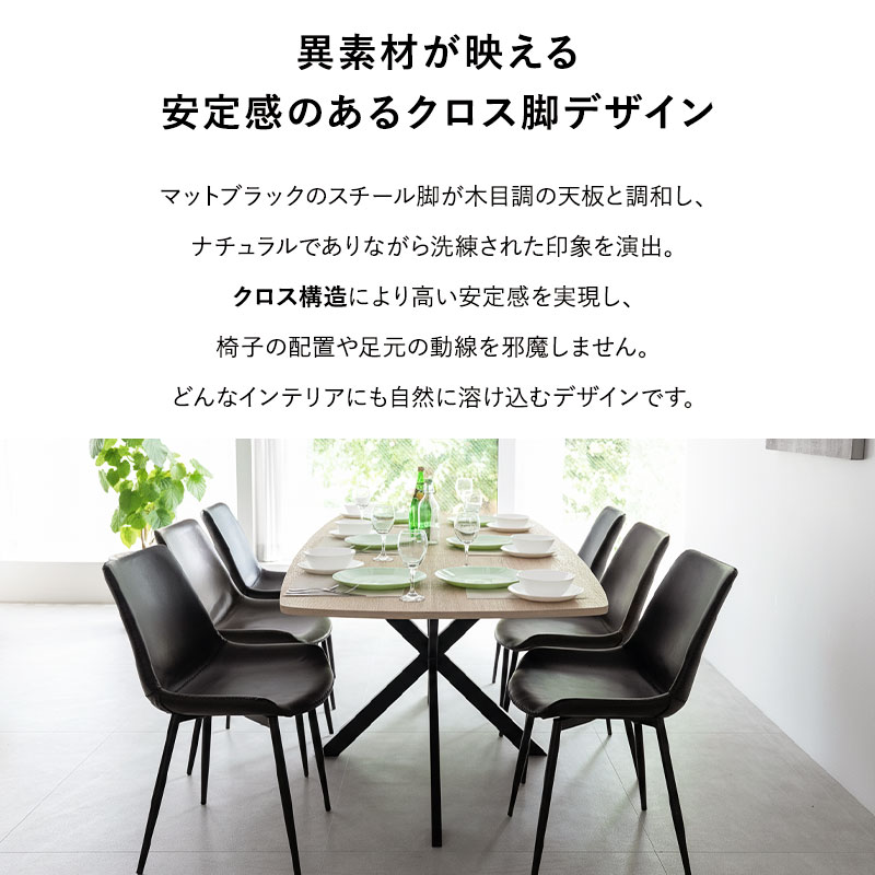 マットブラックのスチール脚が木目調の天板と調和し、ナチュラルでありながら洗練された印象を演出。クロス構造により高い安定感を実現し、椅子の配置や足元の動線を邪魔しません。どんなインテリアにも自然に溶け込むデザインです。