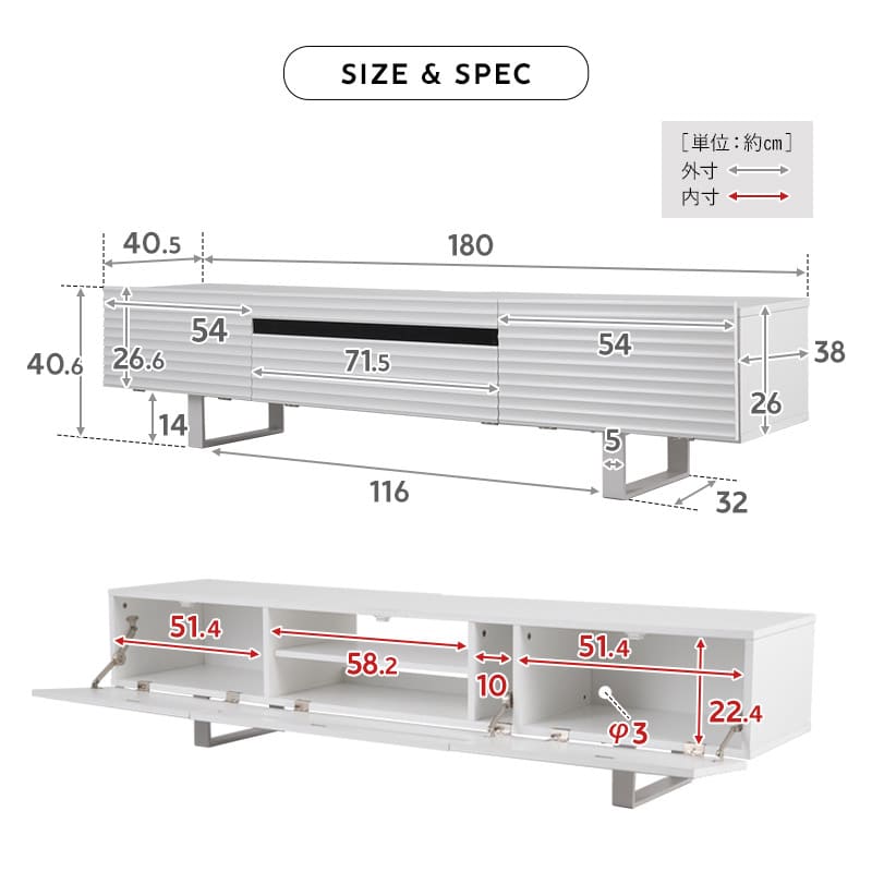 | サイズ | 全体:約幅180×奥行40.5×高さ40.6cm フラップ扉内収納部内寸(左右):約幅51.4×奥行38×高さ22.4cm 中央収納部内寸:約幅58.2×奥行38×高さ22.4cm |