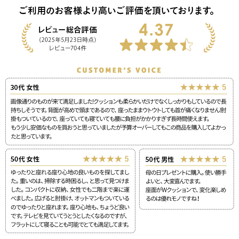 | サイズ | <ファブレザータイプ> 全体:約幅65×奥行74-106×高さ68cm 座面:約幅50×奥行50-100cm 座面高:約8/17cm 肘幅:約8cm 背もたれ:約幅50×長さ57cm 重量:約7.5kg <ジャガード生地タイプ> 全体:約幅65×奥行74-106×高さ68cm 座面:約幅50×奥行50-100cm 座面高:約8/17cm 肘幅:約8cm 背もたれ:約幅50×長さ57cm 重量:約7.0kg ※計測する位置や角度により、若干の誤差が生じる場合があります。 |