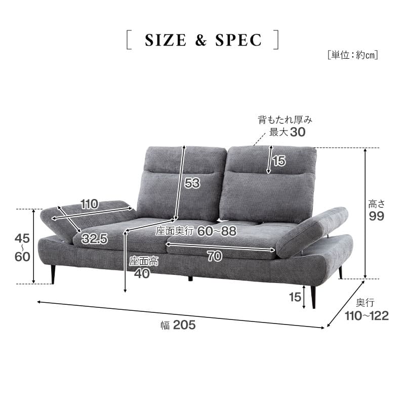 | サイズ | 全体:約幅205×奥行110-122×高さ99cm 座面:約幅140×奥行60-88×高さ40cm 背もたれ:約幅140×長さ53cm |