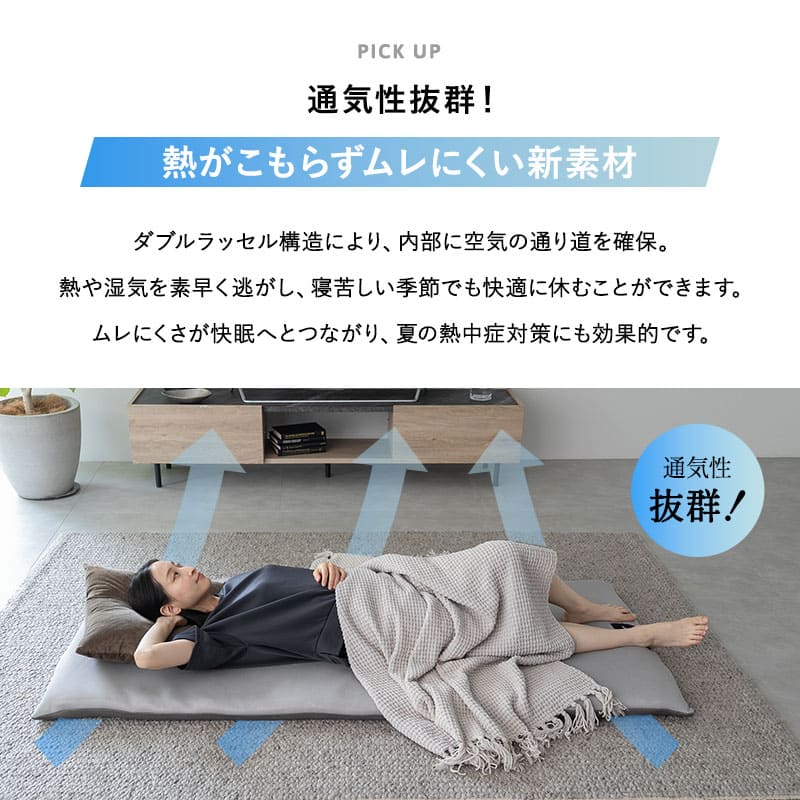 中材にダブルラッセル構造を採用。熱を溜め込まない構造なので、真夏でもサラッと快適。暑い季節に感じやすい“暑さ”や“蒸れ”の悩みを解消し、汗ばむ季節でも心地よくお使いいただけます。