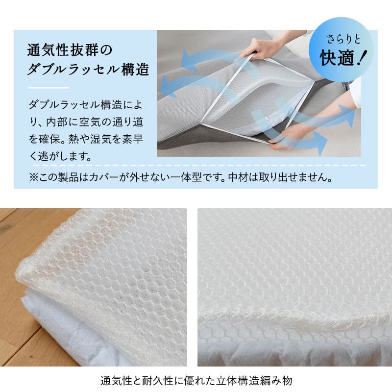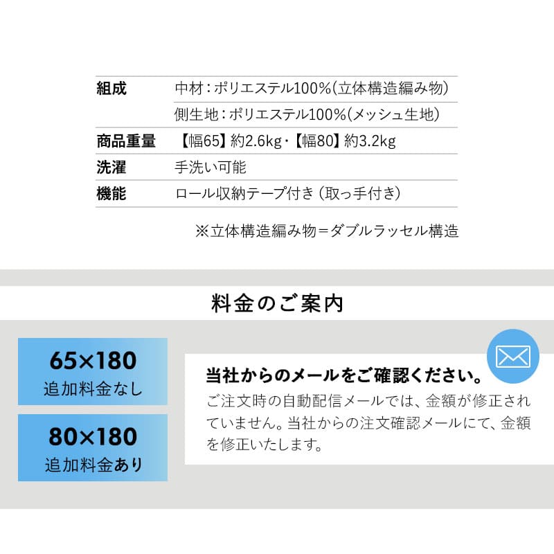 | 組成 | 側生地:ポリエステル100%(メッシュ生地) 中材:ポリエステル100%(立体構造編み物) |