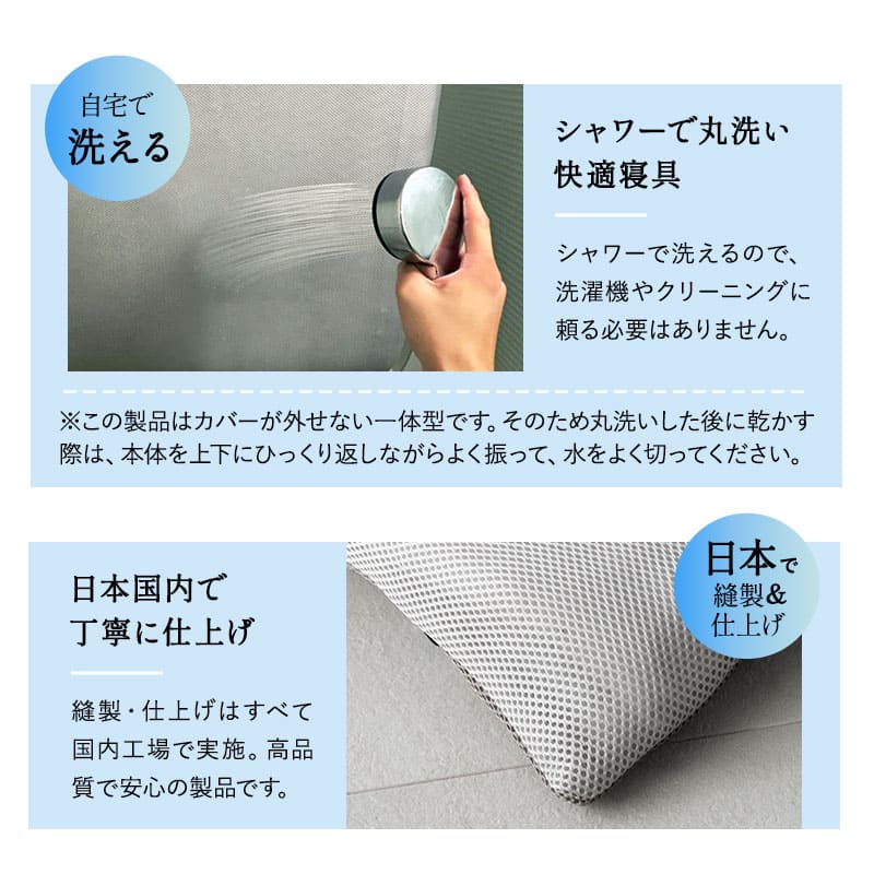 シーズンを問わず丸洗いが可能なため、汗や汚れを気にせず、いつでも清潔。衛生面を重視する方や家族での共用にも安心です。