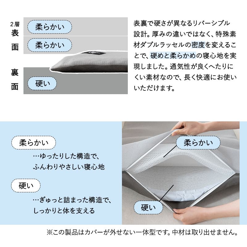 柔らかい面と硬い面の2層設計。その日の体調や気分に合わせて寝心地を選べるため、腰や体への負担を軽減し、自然な寝姿勢をサポートします。