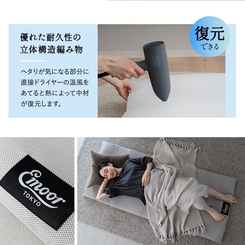 中材は、ヘタってきてもドライヤーなどの温風で復活!簡単にボリュームを戻すことができる再生力のある中材を採用することで、買い替え頻度を減らし、長期的に快適な使用が可能です。