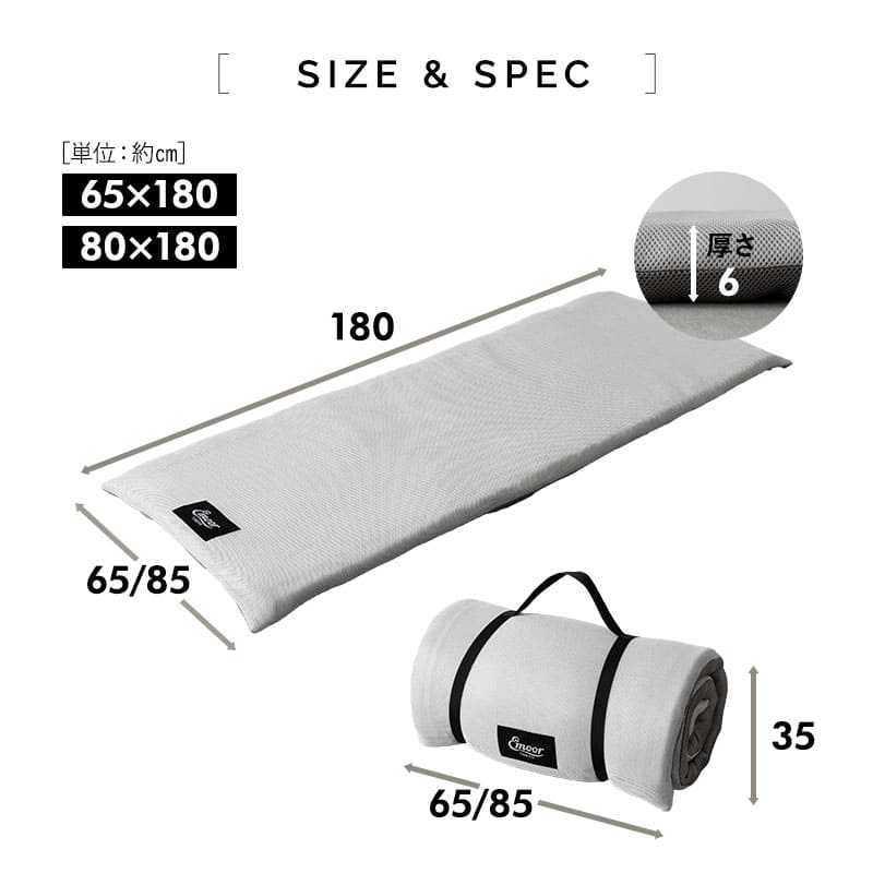 | サイズ | ■コンパクトショートサイズ 約幅65×奥行180×厚さ6cm (折りたたみ時:約幅65×奥行35×高さ35cm) ■セミシングルショートサイズ 約幅85×奥行180×厚さ6cm (折りたたみ時:約幅80×奥行35×高さ35cm) |