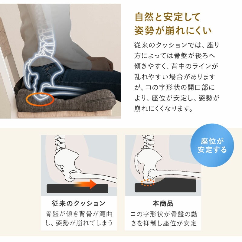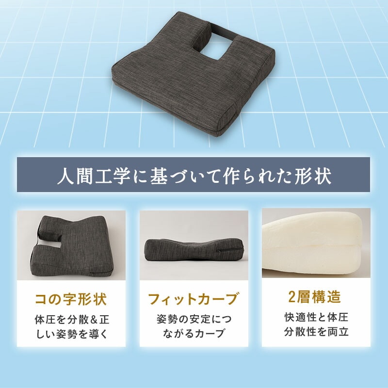 座骨の真下に圧が集中しにくい形状で、長時間座る場合でも、理想的な姿勢を自然と導く設計です。コの字形状の開口部により、座位が安定し、姿勢が崩れにくくなります。