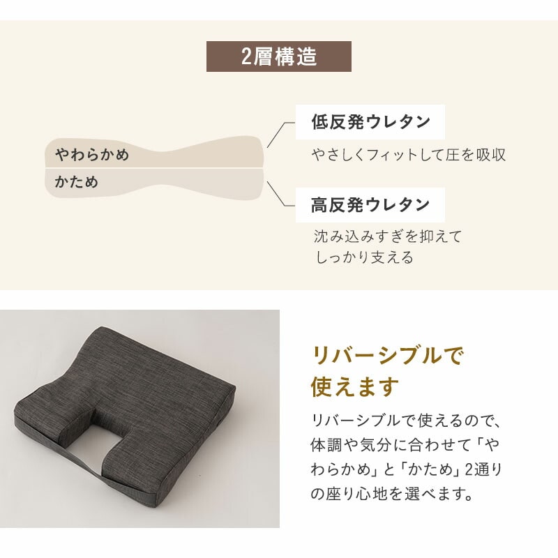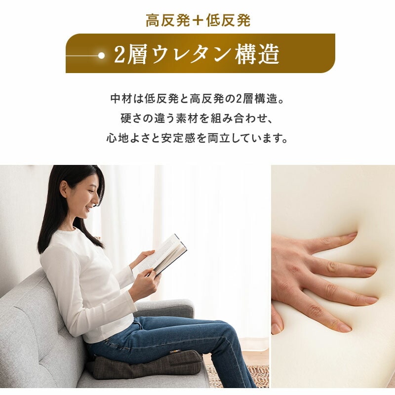 中材は、低反発と高反発の2層構造。硬さの違う素材を組み合わせ、心地よさと安定感を両立しています。リバーシブルで使えるので、体調や気分に合わせて「やわらかめ」と「かため」2通りの座り心地を選べます。