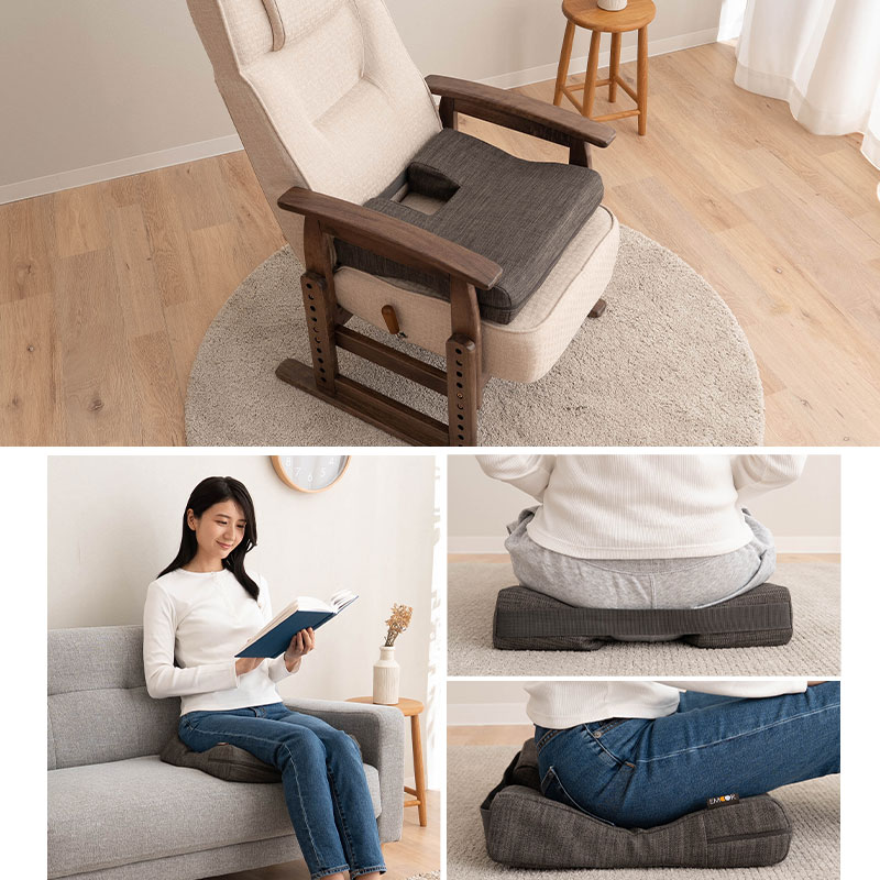“安楽姿勢”がとれる高座椅子などと合わせて使うと、より自然に心地よさが引き立ちます。前傾姿勢よりも、ゆったりくつろいだ姿勢のほうが、コの字形状の開口部が座骨まわりにやさしくフィットします。