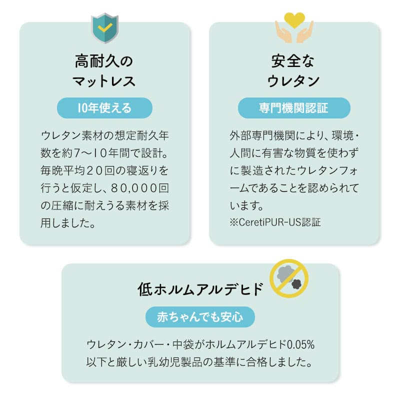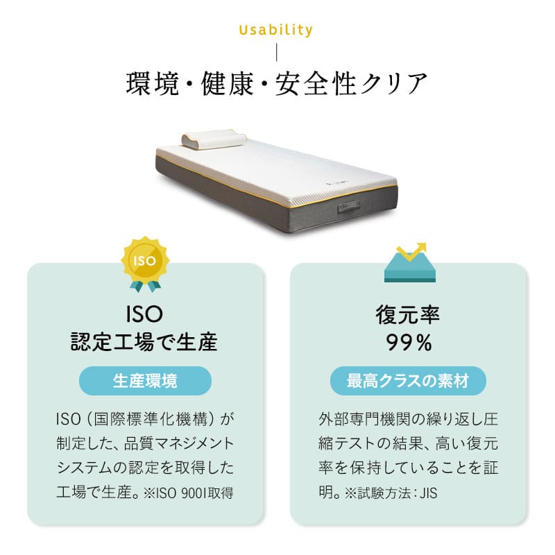 安心安全な素材を使用し、ISO(国際標準化機構)が制定した、品質マネジメントシステムの認定を取得した工場で生産されたマットレスです。低ホルムアルデヒドで、赤ちゃんでも安心してご使用いただけます。