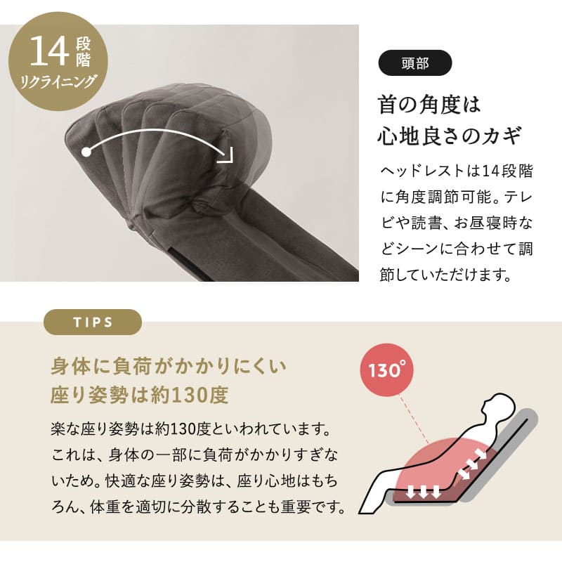 背もたれは座ったまま無段階でリクライニングが可能。また、ヘッドレストの角度も簡単に調節できるので、利用シーンや好みのに合った角度で、ゆったりお寛ぎいただけます。