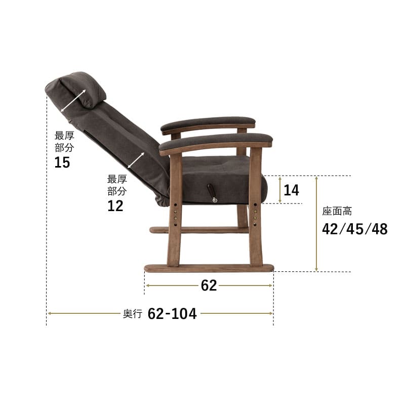 座面は3段階の調節が可能。約3cm幅で調節ができ、座面高は最高約48cmまで上げることが可能です。体格の大きな方でもゆったりとおくつろぎいただけます。