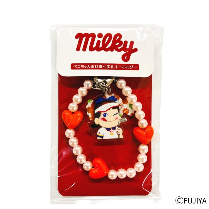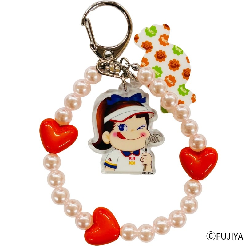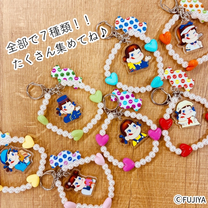 ペコちゃんとミルキーを模ったアクリルに、淡いピンク色のビーズとオレンジのハートを組み合わせたアクリルキーホルダー。