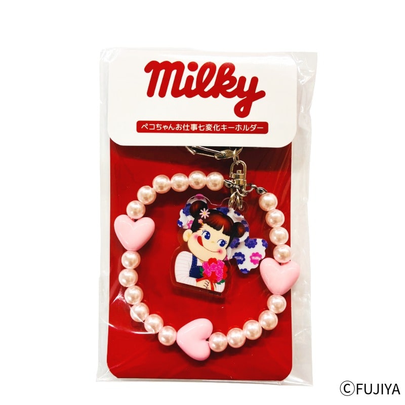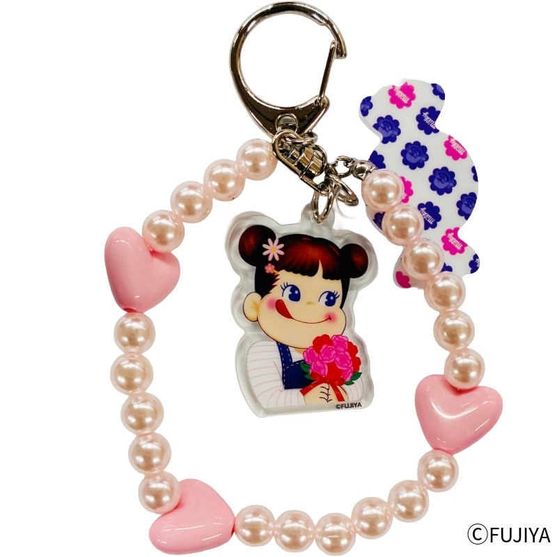 ペコちゃんとミルキーを模ったアクリルに、淡いピンク色のビーズと淡いピンクのハートを組み合わせたアクリルキーホルダー。
