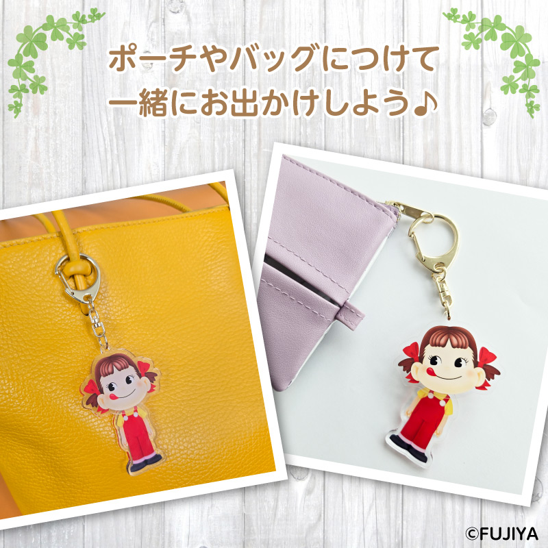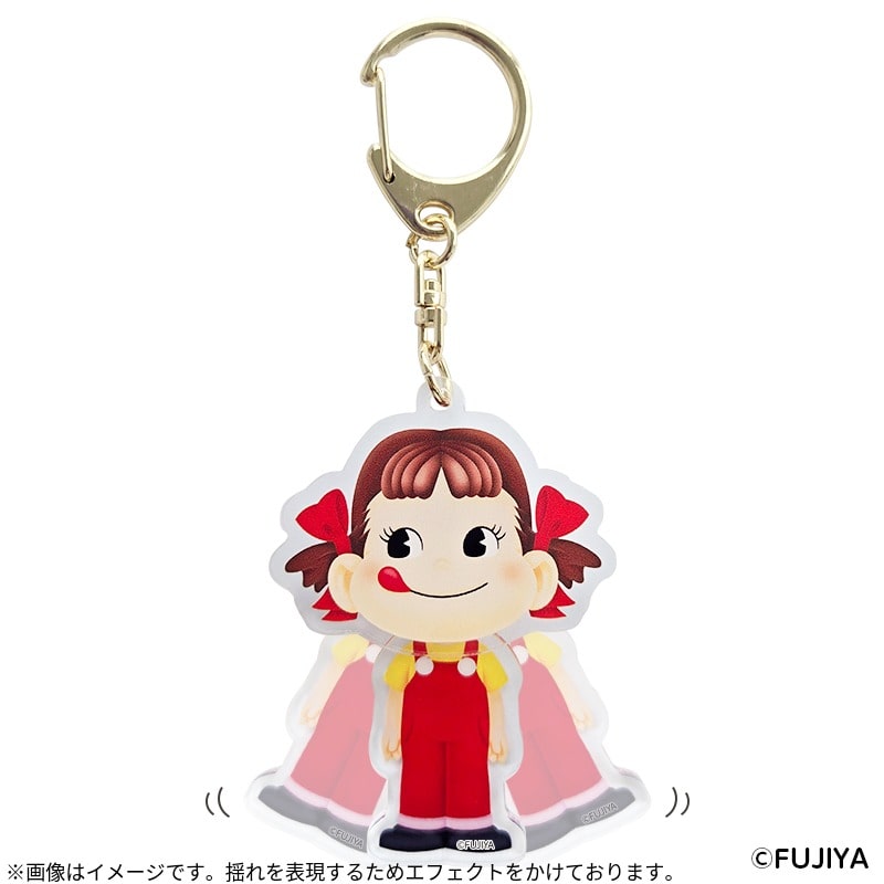 ペコちゃんのお顔と体が別々のアクリルになっていて体がゆらゆら揺れる仕様になっております。 思わずふりふりしたくなるかわいいキーホルダーです。