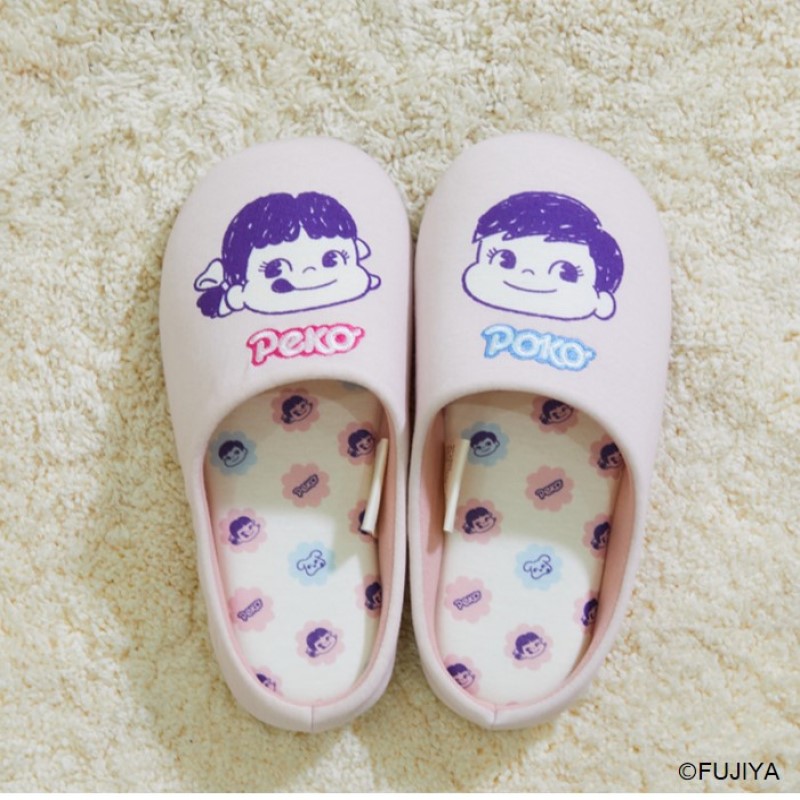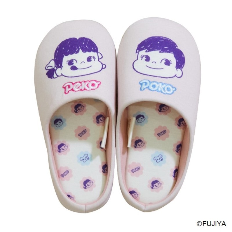 左にペコちゃん、右にポコちゃんのお顔がプリントされたかわいいルームシューズです。 中はミルキー柄になっています。 また、ポリエステル100%かつクッション素材のため履き心地がよく一年中快適に使用できます。