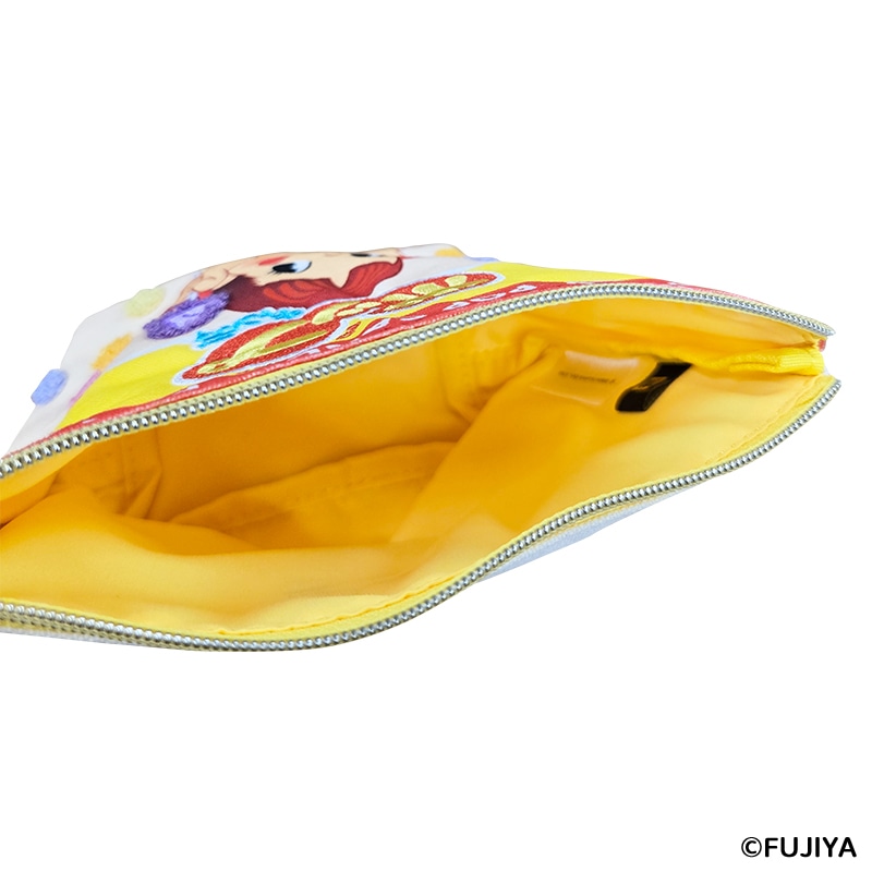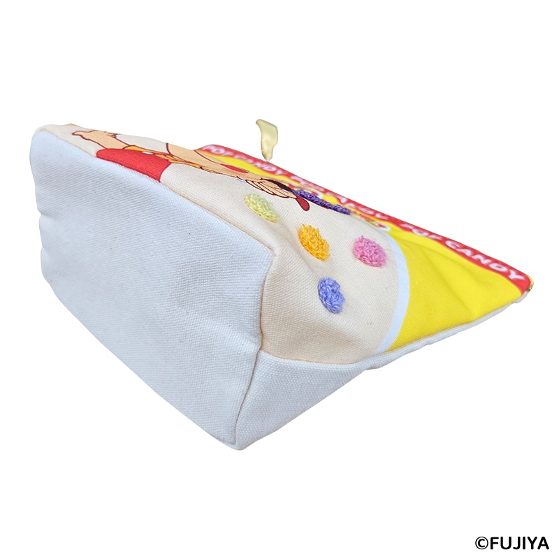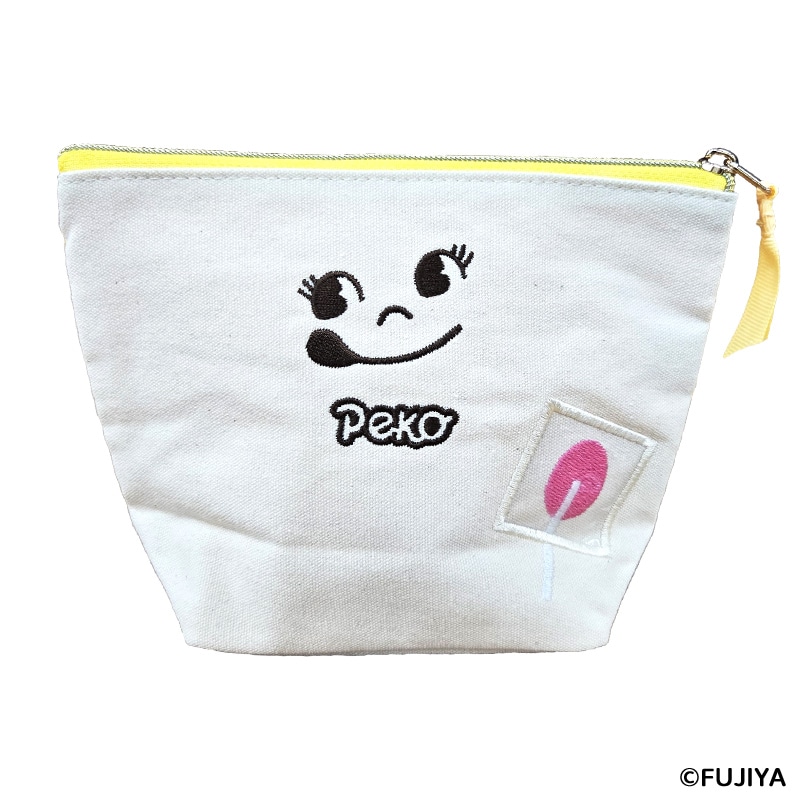 ペコちゃんとポップキャンディがデザインされたポーチです! ポップキャンディはサガラ刺繍になっています。 裏面のポップキャンディもかわいいポイントです! マチがあるので普段使いに大変便利です♪