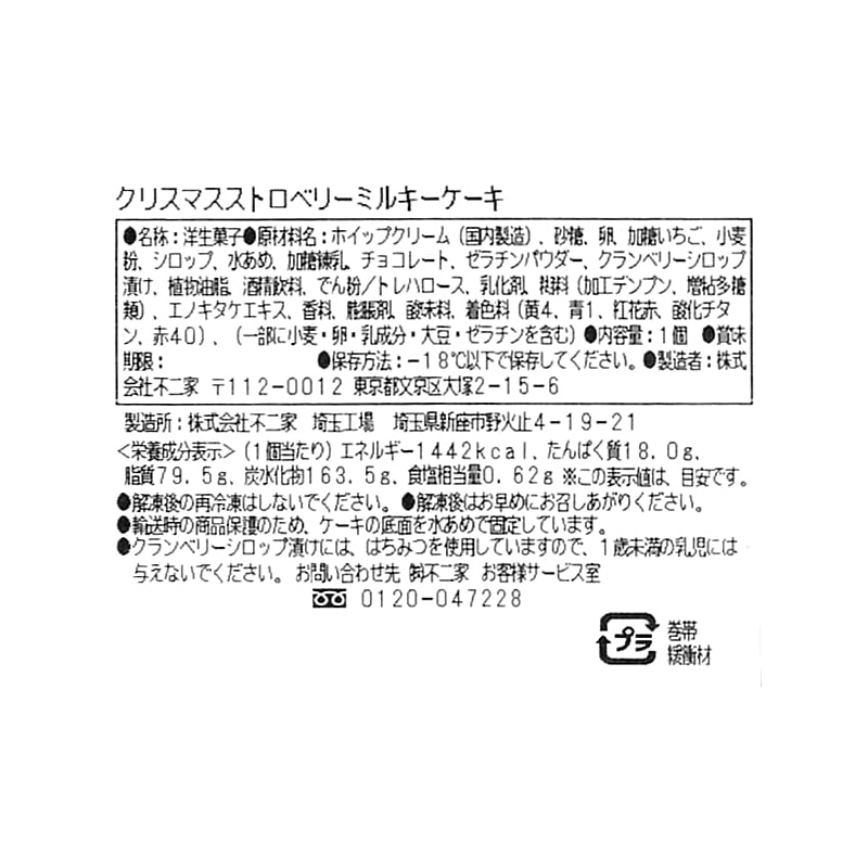 ■原材料名:ホイップクリーム(国内製造)、砂糖、卵、加糖いちご、小麦粉、シロップ、 水あめ、加糖練乳、チョコレート、ゼラチンパウダー、クランベリーシロップ漬 け、植物油脂、酒精飲料、でん粉/トレハロース、乳化剤、糊料(加工デンプン、 増粘多糖類)、エノキタケエキス、香料、膨脹剤、酸味料、着色料(黄4、青1、 紅花赤、酸化チタン、赤40)、(一部に小麦・卵・乳成分・大豆・ゼラチンを 含む)