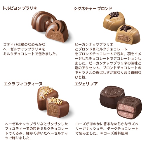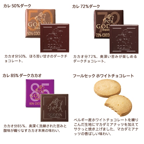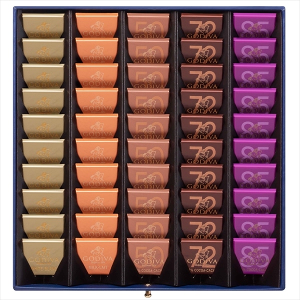 ベルギー王室御用達ブランドとして長きにわたり伝統を継承し、革新を重ねてきたゴディバならではのラグジュアリーコレクション。ゴディバの歴史を語るに欠かせないアートのように美しいチョコレートの数々やシンプルで繊細なカレ、ベルギー産チョコレートを練りこみ焼き上げたフールセックを、シンプルながらもゴージャスに仕上げたレザー風のボックスに贅沢に詰め合わせました。特別なひと箱と共に、大切な方との素敵な時間をお過ごしください。