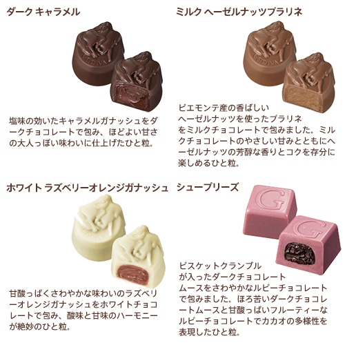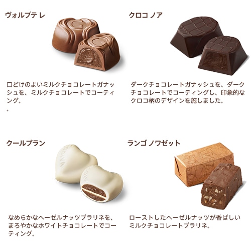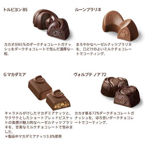 チョコレート:砂糖、カカオマス、ココアバター、全粉乳、ヘーゼルナッツ、バターオイル、異性化液糖、脱脂粉乳、乳等を主要原料とする食品、キャラメルソース、植物油脂、アーモンド、バター、加糖練乳、転化糖、ラズベリー果汁、ピーカンナッツ、キャラメルパウダー、小麦粉、ココアパウダー、マカダミアナッツ、粉糖、オレンジパウダー、オレンジ果汁、カラメルソース、ラズベリーパウダー、食塩、乳脂肪、乳たん白、乳糖、バニラパウダー、はちみつ、大麦エキス、牛乳、米粉、コーヒー、カカオニブ、クリーム/ソルビトール、乳化剤、グリセリン、香料、酸味料、(一部に小麦・乳成分・アーモンド・オレンジ・大豆・マカダミアナッツを含む)