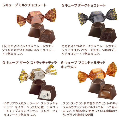 「ホワイトチョコレートプラリネ」、「ミルク」、「ダーク」、さらに2026年に新登場した「ストラッチャテッラ」のG キューブ チョコレートを詰め合わせました。