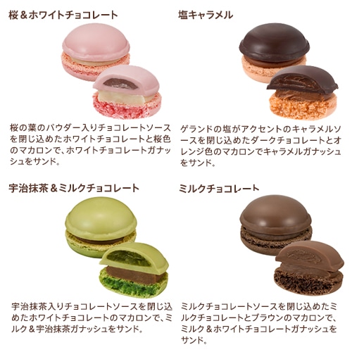 食感の異なるチョコレート、マカロン、ガナッシュのマリアージュをお楽しみください。
