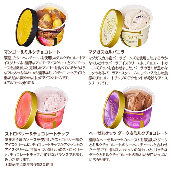 砂糖(国内製造)、クリーム、マンゴーソース(マンゴー、砂糖、水飴、その他)、 脱脂粉乳、マンゴーピューレ、チョコレート、バター、ココアパウダー、加糖卵黄、 でん粉、寒天、こんにゃく粉/乳化剤、香料、酸化防止剤(V.C)、 メタリン酸Na、pH調整剤、増粘多糖類、カロテノイド色素、酸味料、 セルロース、乳酸Ca、(一部に乳成分・卵・大豆を含む)