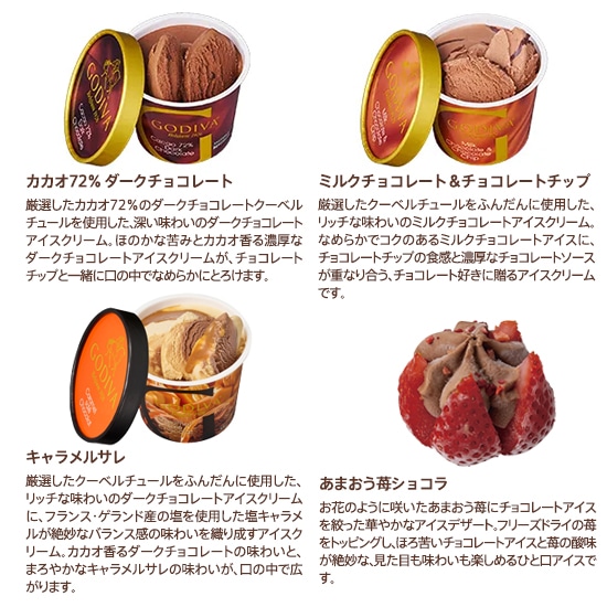 クリーム(国内製造)、砂糖、脱脂粉乳、キャラメルソース(乳製品、水飴、砂糖、寒天、食塩)、チョコレート、水飴、キャラメルペースト、バター、ココアパウダー、加糖卵黄、でん粉、カカオマス、食塩、寒天、こんにゃく粉/乳化剤、香料、安定剤(グァーガム)、pH調整剤、増粘剤(キサンタンガム)、(一部に乳成分・卵・大豆を含む)