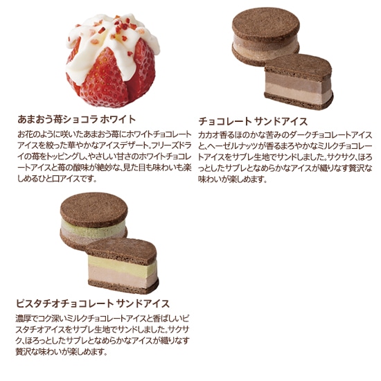 いちご(福岡県産)、クリーム、砂糖、チョコレート、脱脂粉乳、水飴、ココアパウダー、乾燥いちご、ゼラチン/安定剤(増粘多糖類)、乳化剤、香料、(一部に乳成分・大豆・ゼラチンを含む)