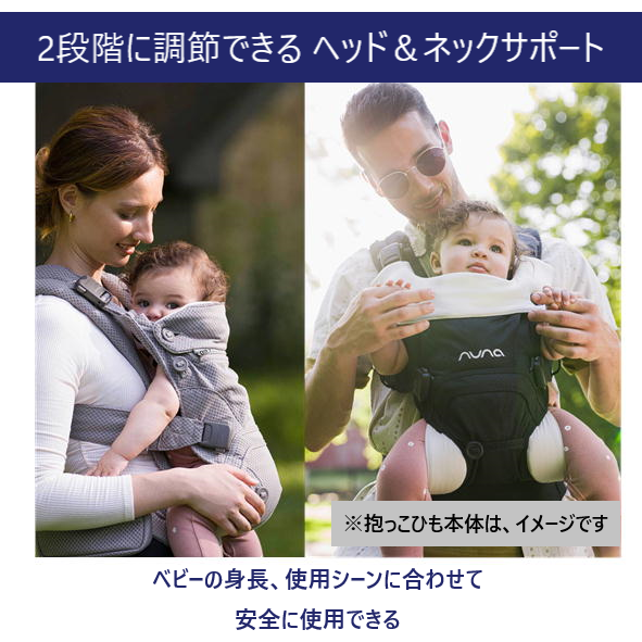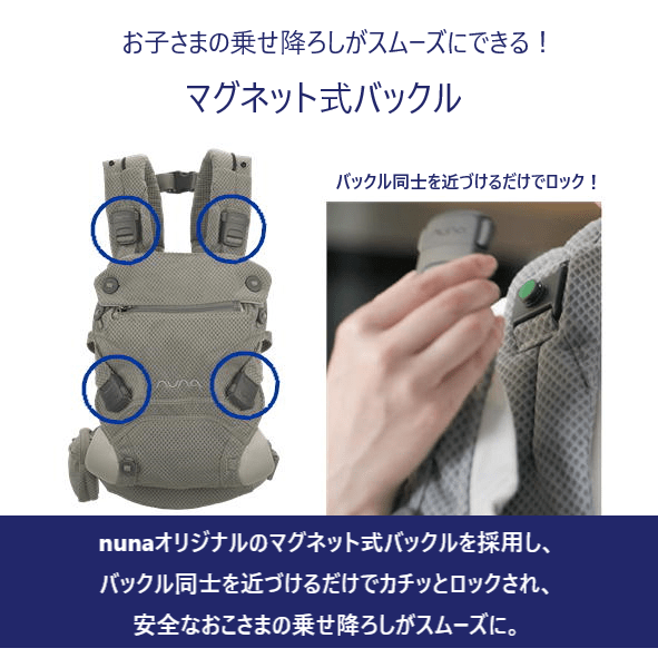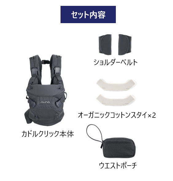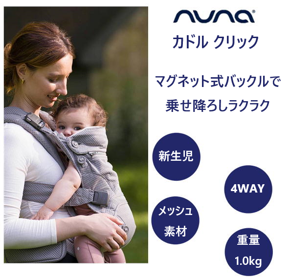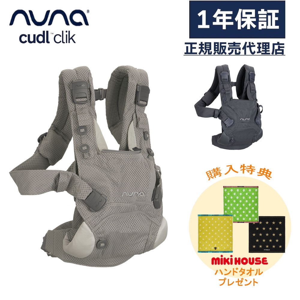 【数量限定】nunaカドルクリックお買い上げで、「mikihouseハンドタオル」おひとつプレゼント。 ※柄は選べません。※数量限定のため、なくなり次第終了します。 デザイン先進国、オランダ生まれのプレミアムブランド「nuna(ヌナ)」!マグネット式バックルで乗せ降ろしが楽々な大人気のベビーキャリアCUDL(カドル)シリーズの新モデルCUDL clik(カドル クリック)。新生児から体重16kg(36ヶ月頃)まで、4つのスタイルで着用することができます。【特徴】・メッシュ素材で1年中快適・生後4ヶ月まで使用できる乳児ブースター付き・新生児から36ヶ月頃まで、4通りの抱き方ができる(対面抱っこ(4ヶ月頃まで)・対面抱っこ(4ヶ月頃から)・前向き抱っこ・おんぶ)・2段階に調節できるヘッド&ネックサポート・マグネット式のバックルでかんたん装着・サイズ調節可能なウエストベルト&ショルダーストラップ・風や日光から守る一体型の風よけカバー・取り外し可能な便利なポーチ付き・洗い替えに便利、オーガニックコットンスタイ2枚付き【使用年齢】新生児から36ヶ月頃まで【使用対象】対面抱っこ(乳幼児ブースターあり):新生児(体重3.5kg)から4ヶ月頃(首すわり前)まで対面抱っこ:4ヶ月頃(首すわり後)から24ヶ月頃(体重13.5kg)まで前向抱っこ:6ヶ月頃から24ヶ月頃(体重13.5kg)までおんぶ:9ヶ月頃から36ヶ月頃(体重16kg)まで【ウエストベルト】61から145cm【製品サイズ】W33×D35×H48cm【重量】1.0kg(乳幼児ブースター、ヘッドサポート、よだれかけ、ウエストポーチ、収納バッグを除く)1.25kg(付属品あり)【カラー展開】フォグ デニム【製造国】中国【保証期間】1年間【素材】本体:コットンショルダーストラップ:ポリエステルショルダーバックル、サイドバックル:ポリアセタール+ポリアミドフード:オーガニックコットン+リヨセルボタン:ポリプロピレンゴムバンド:ポリエステル+スパンデックス腰ベルト:ポリエステルショルダーストラップ:ポリエステル、ポリアミド背中アジャスター:ポリアセタール背中ベルト:ポリエステル背中バックル:ポリアセタールフード用ボタン:ポリアセタール腰ベルトアジャスター:ポリアミド腰ベルトバックル:ポリアセタールよだれかけ、ショルダーパッド:コットンウエストポケット、収納バッグ:ポリエステル【手入れ方法】洗濯用のネットに入れて洗濯機での洗濯可 ※型崩れや色落ち防止のため手洗いを推奨(30℃以下のぬるま湯)※取扱説明書の、取扱説明、注意事項をご確認の上、正しくご使用ください。モニターの発色によって色が異なって見える場合がございます。