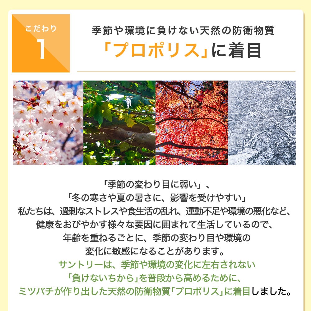 さらにサントリーのサイエンスの結晶、若々しさに嬉しいセサミンEをプラス。季節や環境に負けない力をダブルパワーでサポート。