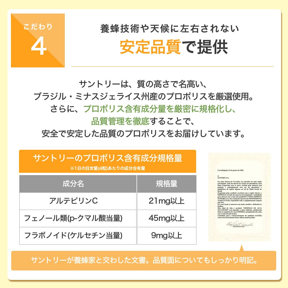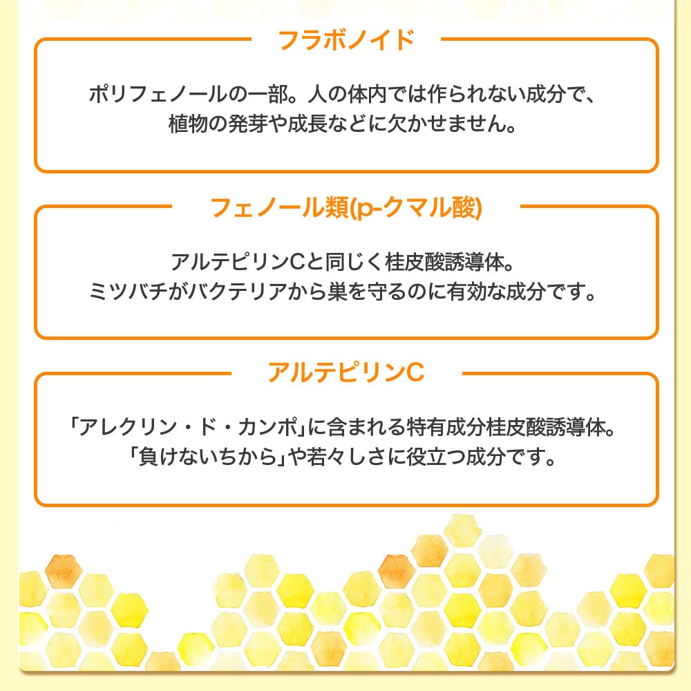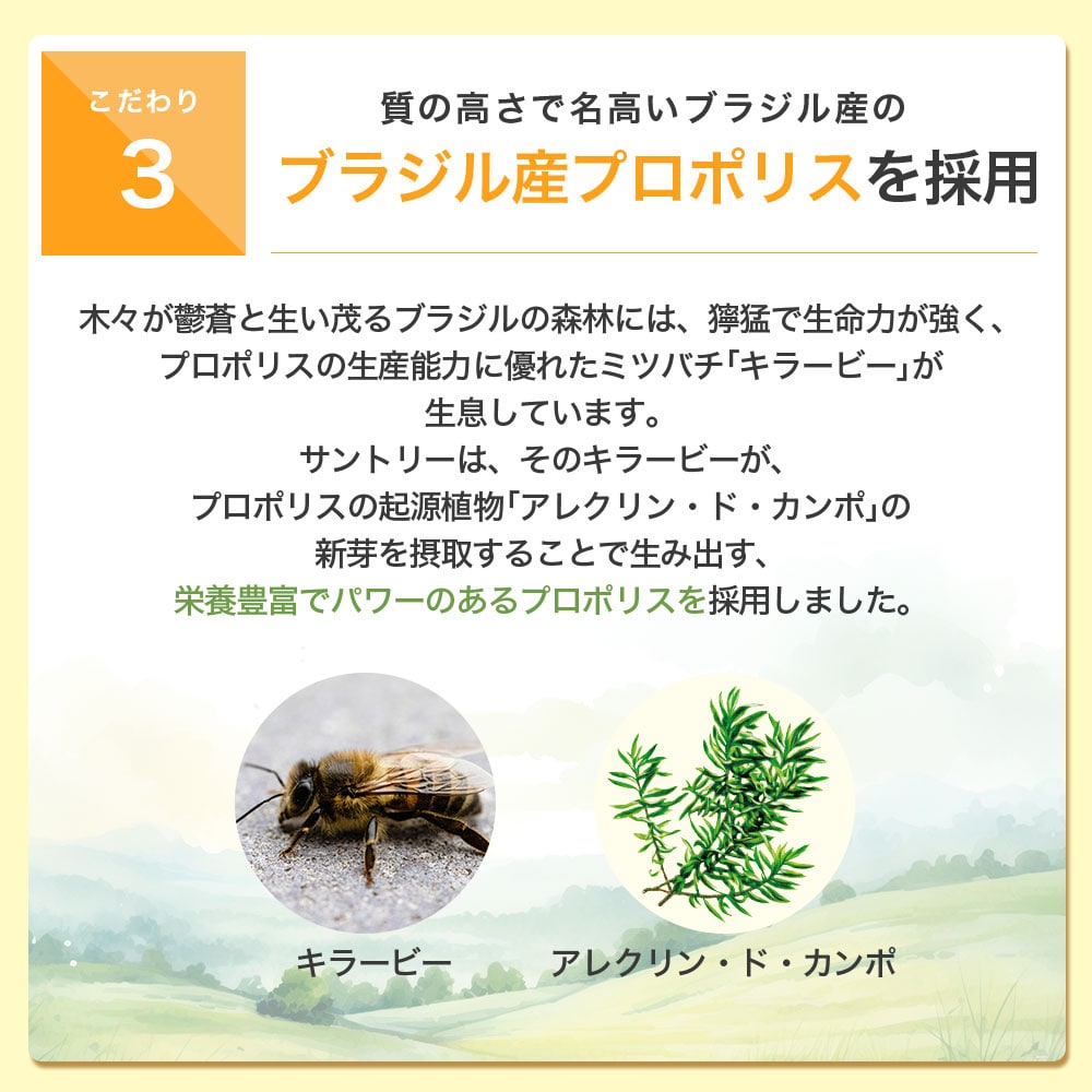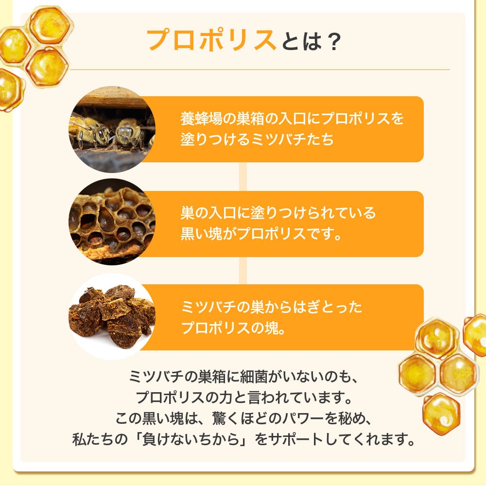 「天然の防衛物質」と呼ばれるプロポリス。良質なプロポリスで知られるブラジル産のものを厳選し、品質管理も徹底。