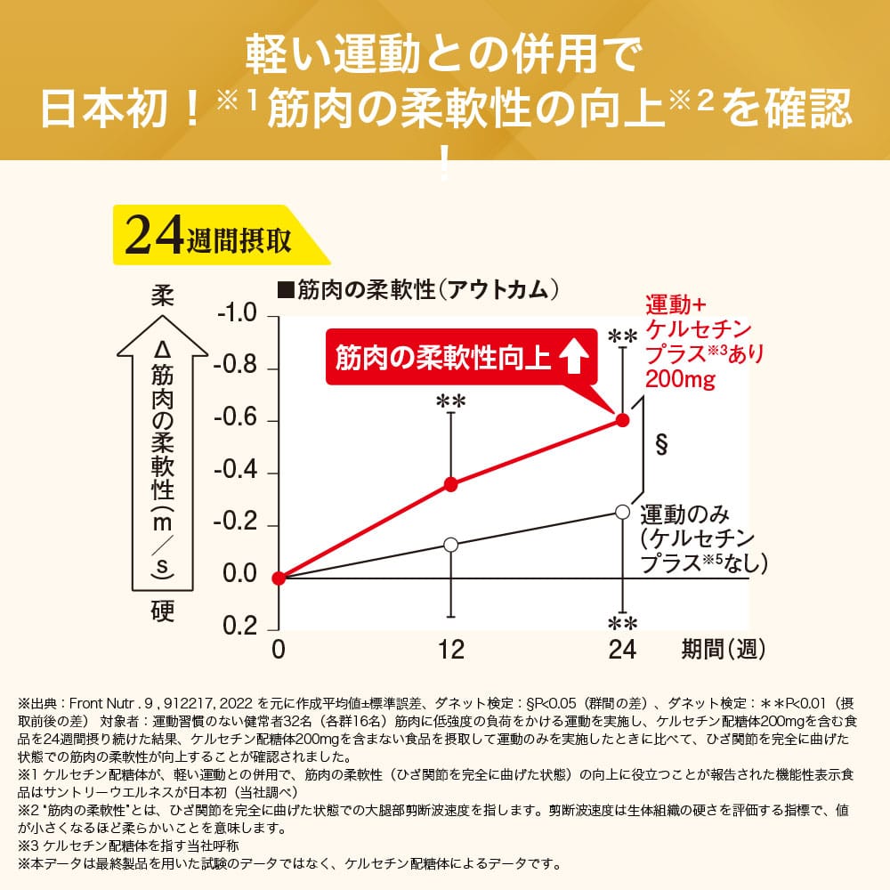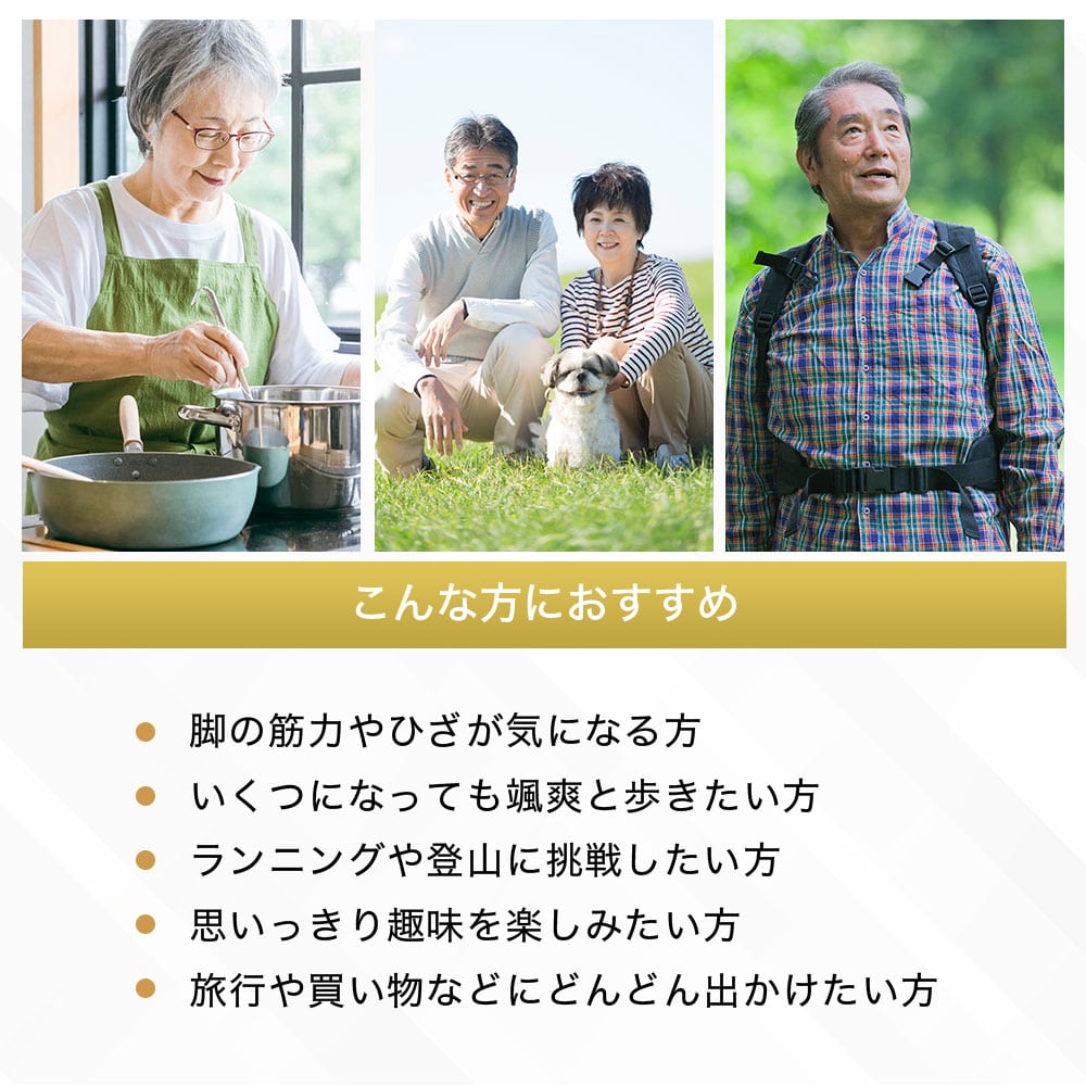 本品に含まれる、グルコサミン塩酸塩、コンドロイチン硫酸、ケルセチン配糖体、アンセリンは、脚の筋力を維持することとひざ関節に働きかけることにより、加齢により衰えるひざ関節を使った動きをスムーズにすること、歩行機能の一部である日常生活における歩く速さを維持することが報告されています。ケルセチン配糖体は、軽い運動との併用で、加齢により衰える筋肉の柔軟性(ひざ関節を完全に曲げた状態での筋肉の柔らかさ)の向上に役立つことが報告されています。