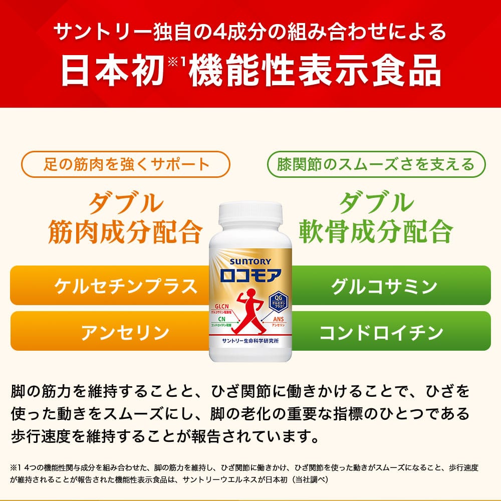 『ロコモア』は筋肉成分であるケルセチンプラス、アンセリン、軟骨成分であるグルコサミン、コンドロイチンの4つの成分を配合しています。サントリー独自配合の筋肉成分と軟骨成分の組み合わせが、脚の筋力を維持することとひざ関節に働きかけることにより、加齢により衰えるひざ関節を使った動きをスムーズにすること、歩行機能の一部である日常生活における歩く速さを維持することが報告されています。 またケルセチンプラスが、軽い運動との併用で、加齢により衰える筋肉の柔軟性(ひざ関節を完全に曲げた状態での筋肉の柔らかさ)の向上に役立つことが報告されています。イキイキとした日常生活にお役立てください。