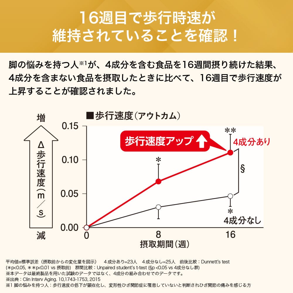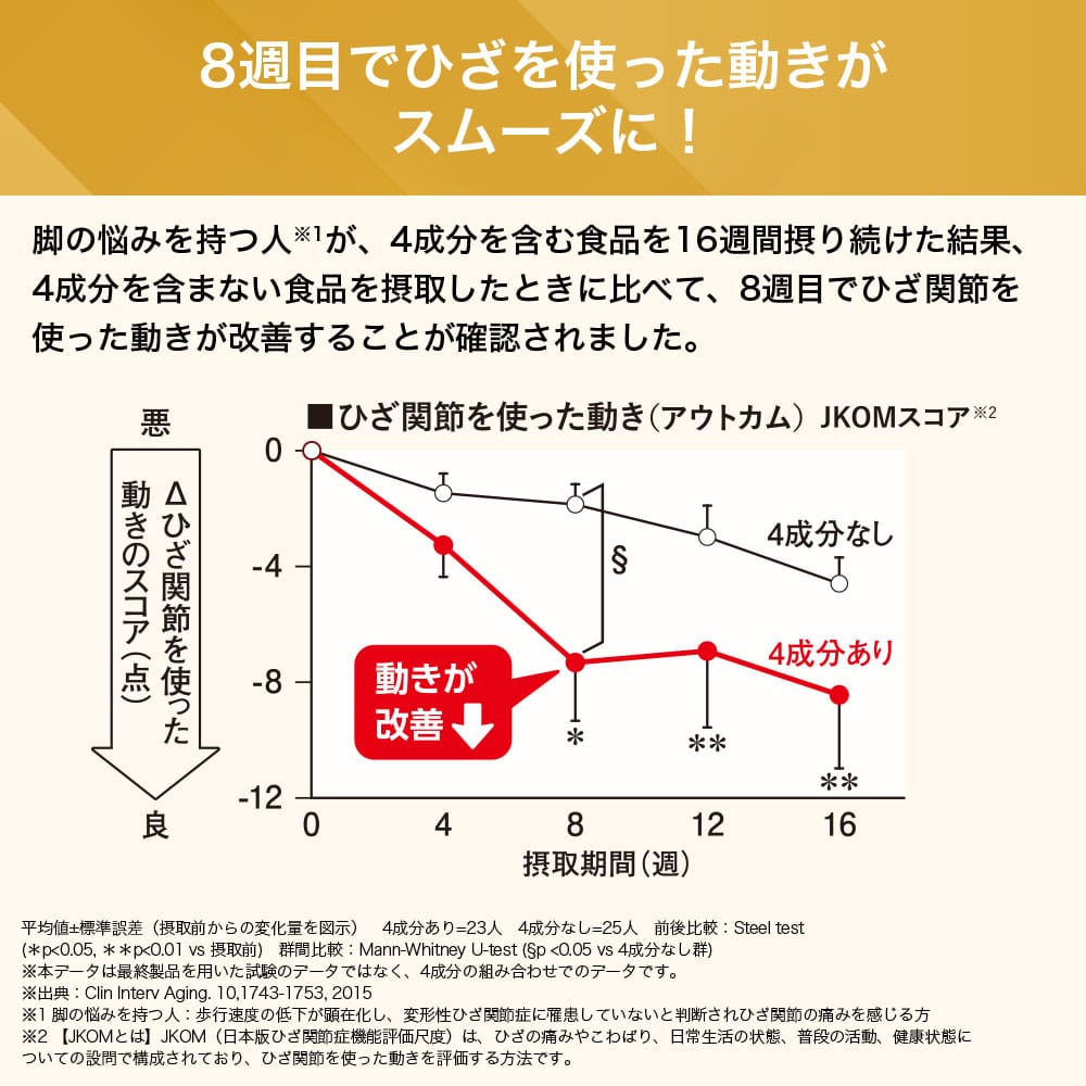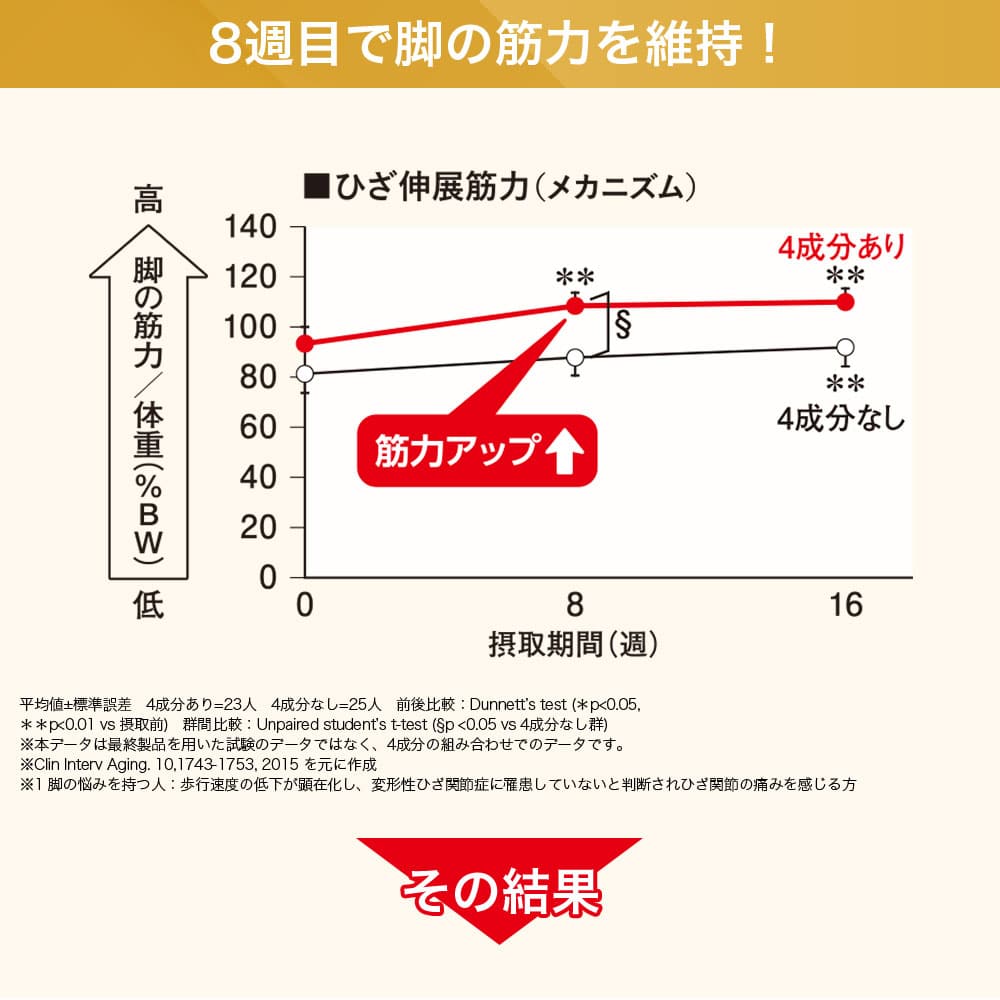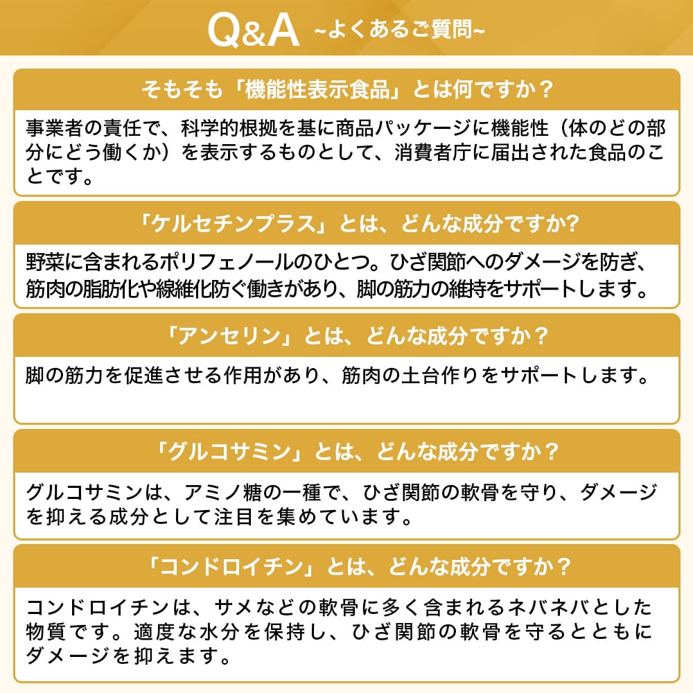 本品に含まれる、グルコサミン塩酸塩、コンドロイチン硫酸、ケルセチン配糖体、アンセリンは、脚の筋力を維持することとひざ関節に働きかけることにより、加齢により衰えるひざ関節を使った動きをスムーズにすること、歩行機能の一部である日常生活における歩く速さを維持することが報告されています。ケルセチン配糖体は、軽い運動との併用で、加齢により衰える筋肉の柔軟性(ひざ関節を完全に曲げた状態での筋肉の柔らかさ)の向上に役立つことが報告されています。