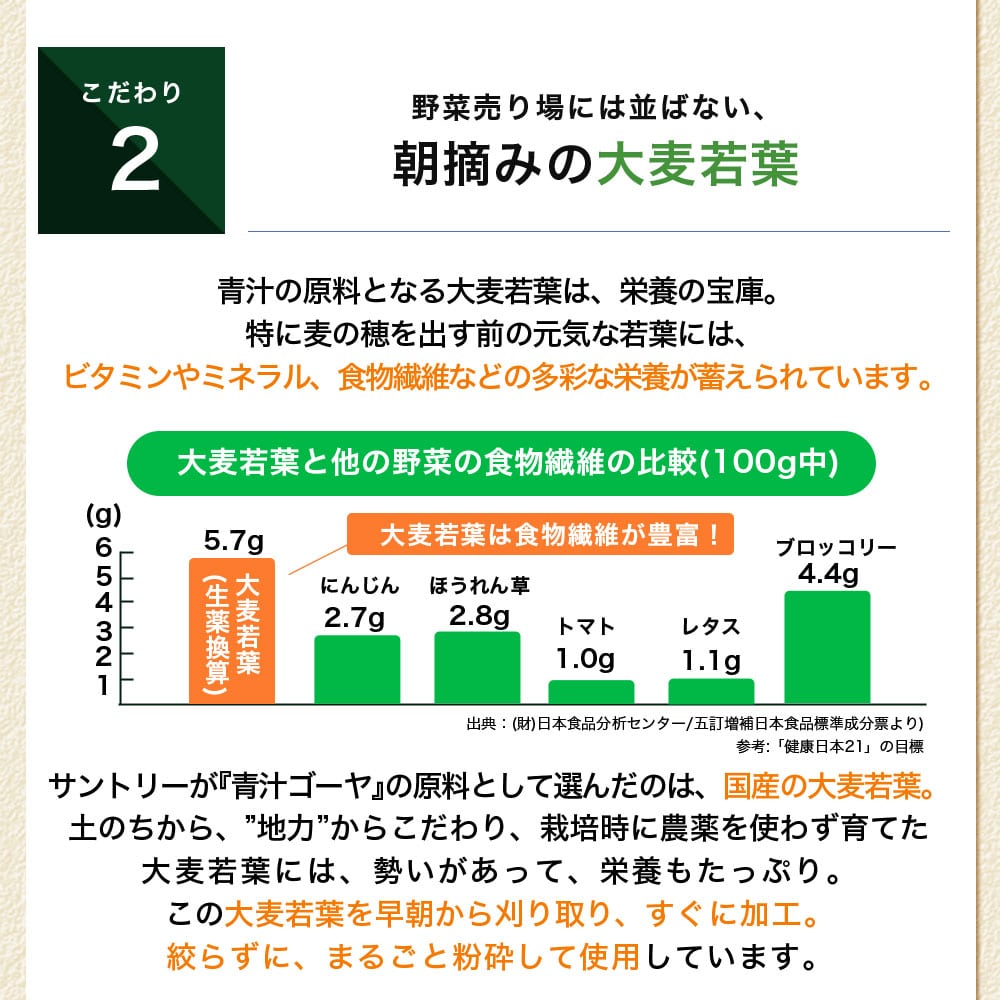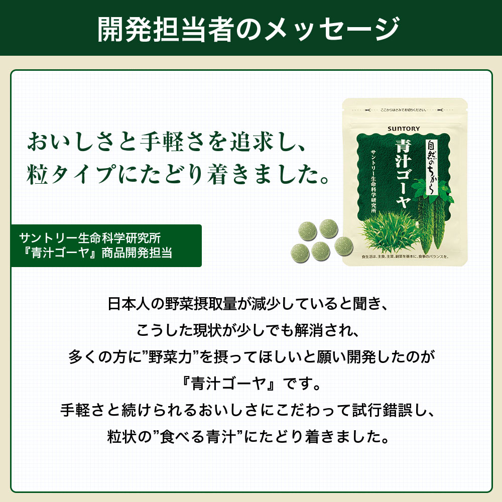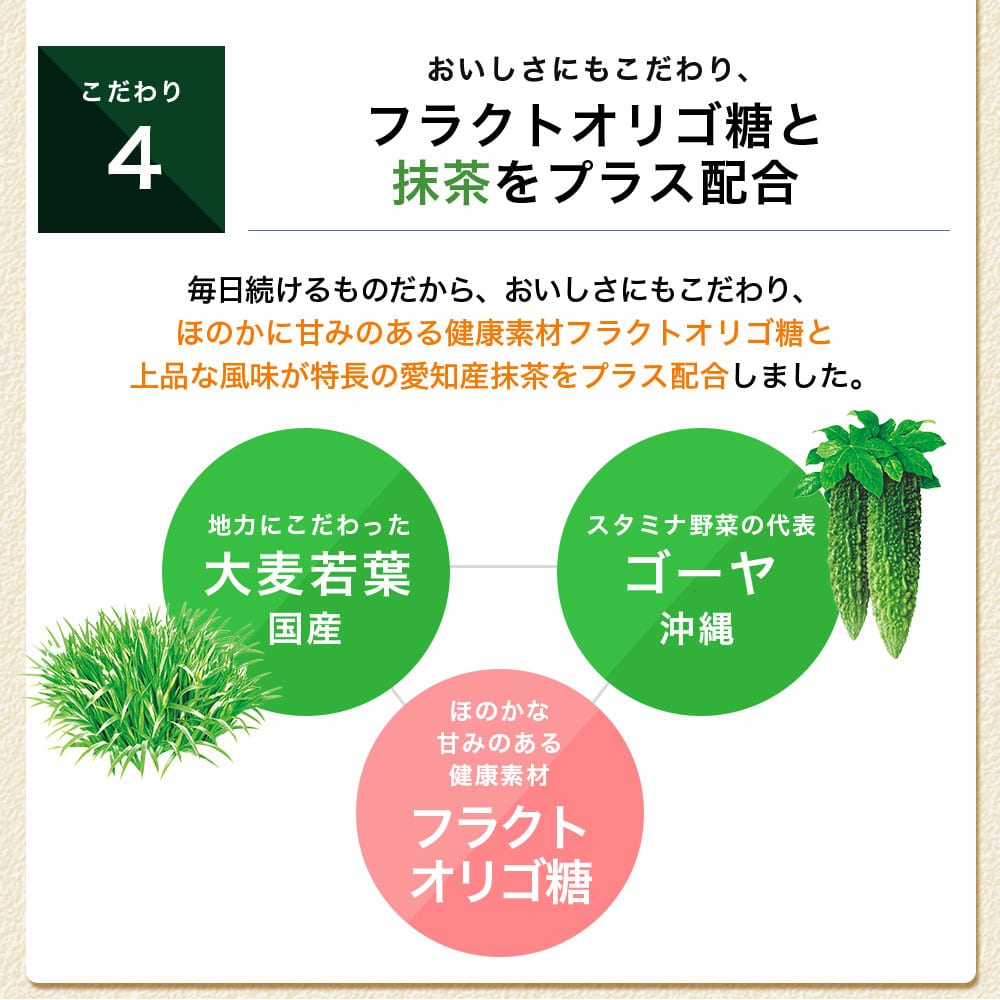 多彩な栄養を含む国産の大麦若葉と、スタミナ野菜で知られる、沖縄産ゴーヤの、2つの“野菜力”を凝縮。