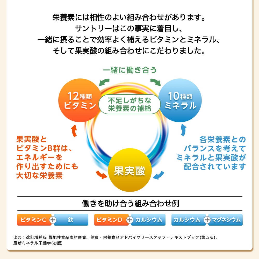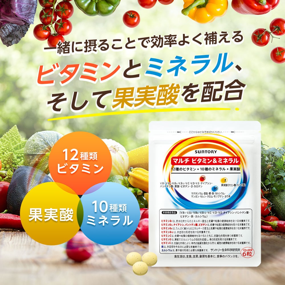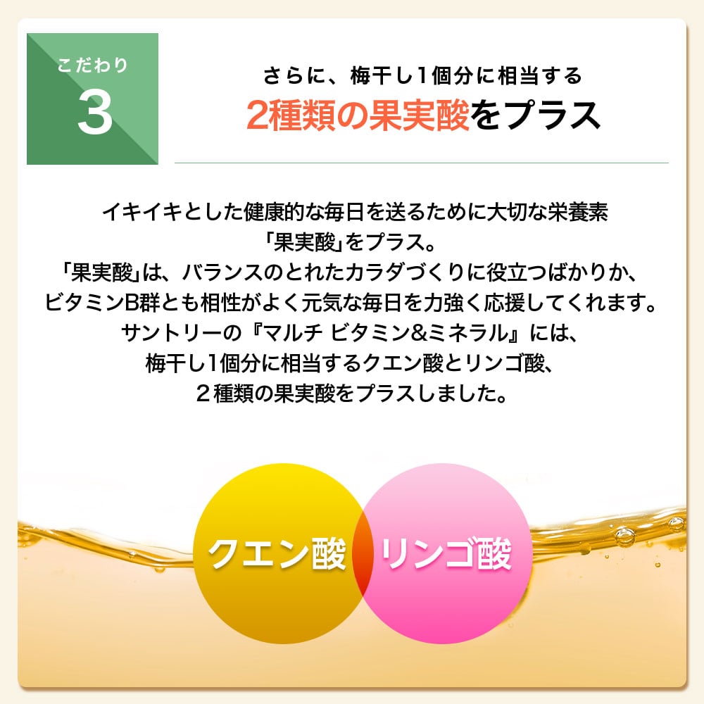 サントリーの『マルチ ビタミン&ミネラル』は、12種類のビタミンと10種類のミネラルに加え、2種類の果実酸を配合。